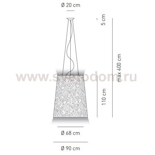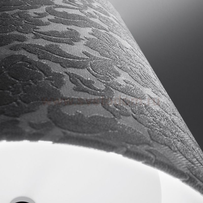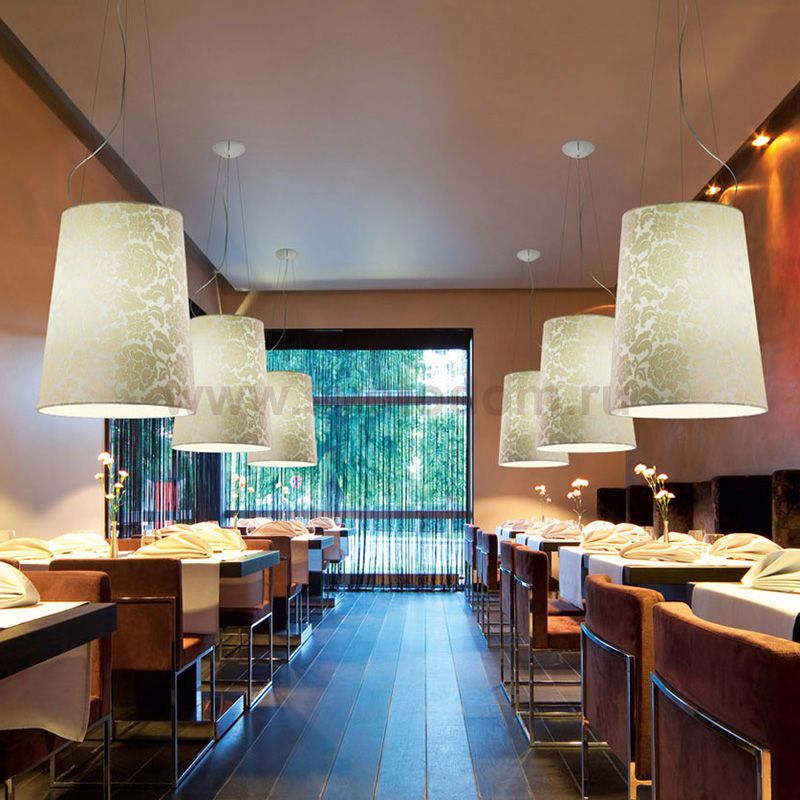 Подвесной светильник из коллекции Damasco. Абажур цвета слоновая кость покрыт дамасской тканью, пропитанной антипиреном. В коллекции два цвета: слоновая кость и серый. Размеры абажуров варьируются от 30 см до 90 см в диаметре. Также доступны модели с лампами накаливания или люминесцентными лампами.
