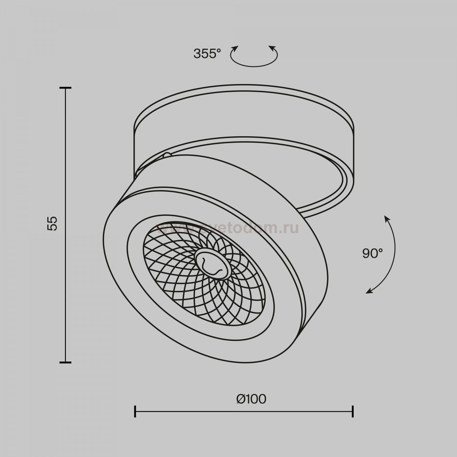 Накладной светодиодный светильник с углом рассеивания света 38°. Направление светового потока регулируется в двух плоскостях: на 360° в горизонтальной и 90° в вертикальной. Светового потока светильника достаточно для освещения пространства отраженным светом.