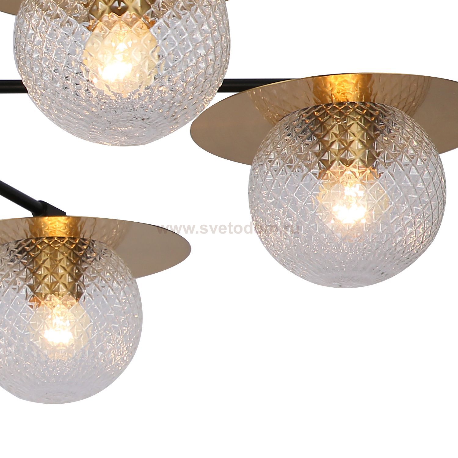 каркас черного матового цвета, плафоны из прозрачного узорного стекла, декоративные элементы в виде металлических блюдец цвета меди Серия