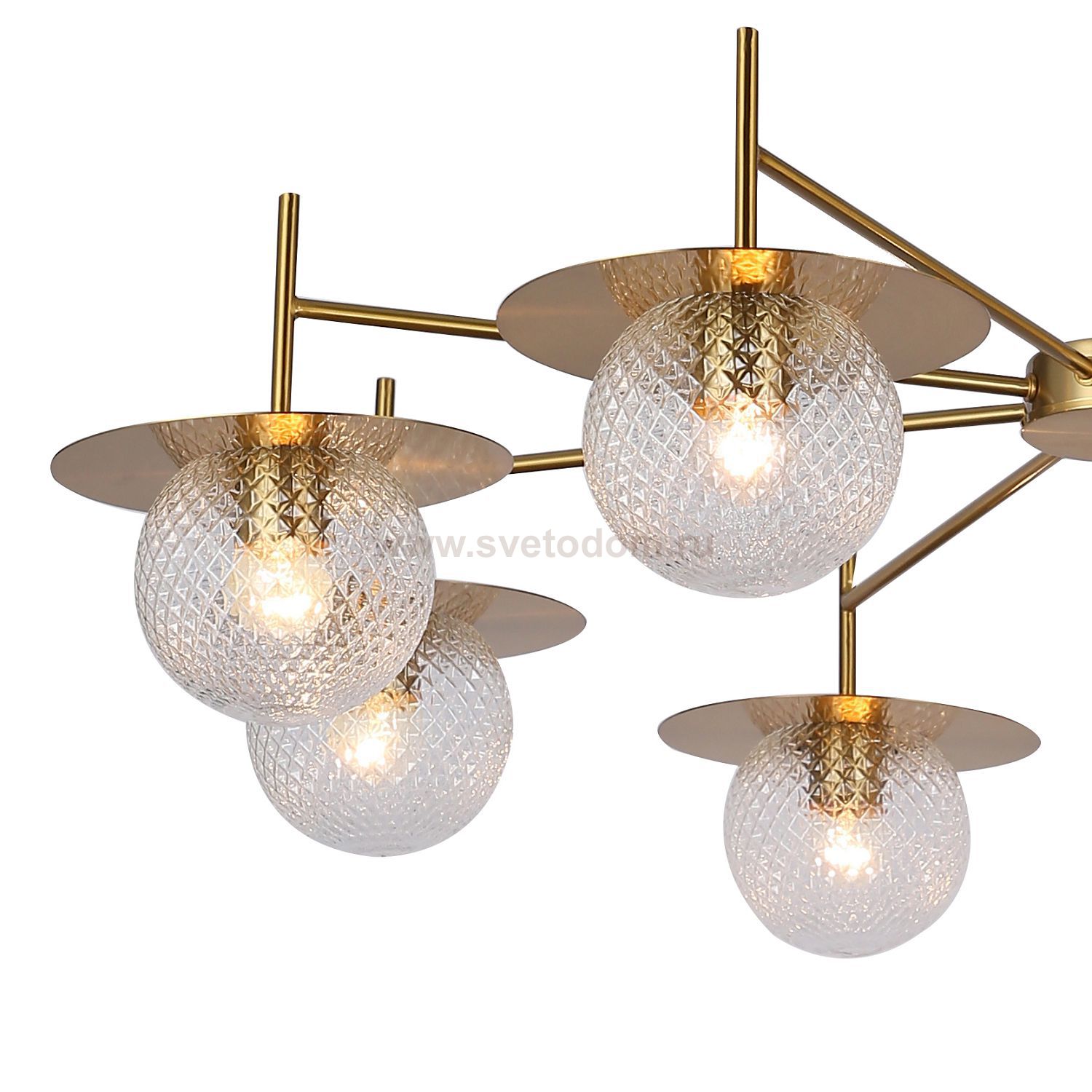каркас цвета меди, плафоны из прозрачного узорного стекла, декоративные элементы в виде металлических блюдец Серия