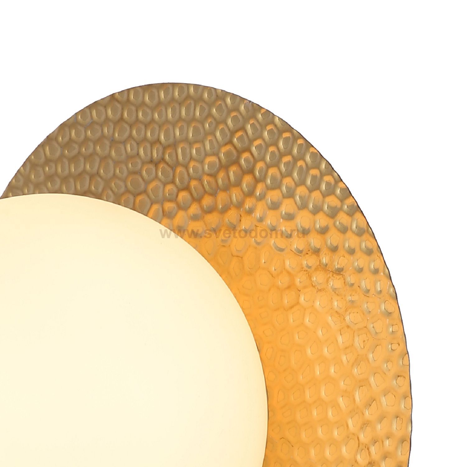 каркас цвета меди, плафон из белого стекла, декоративный элемент в виде металлического узорного блюдца Цвет декора