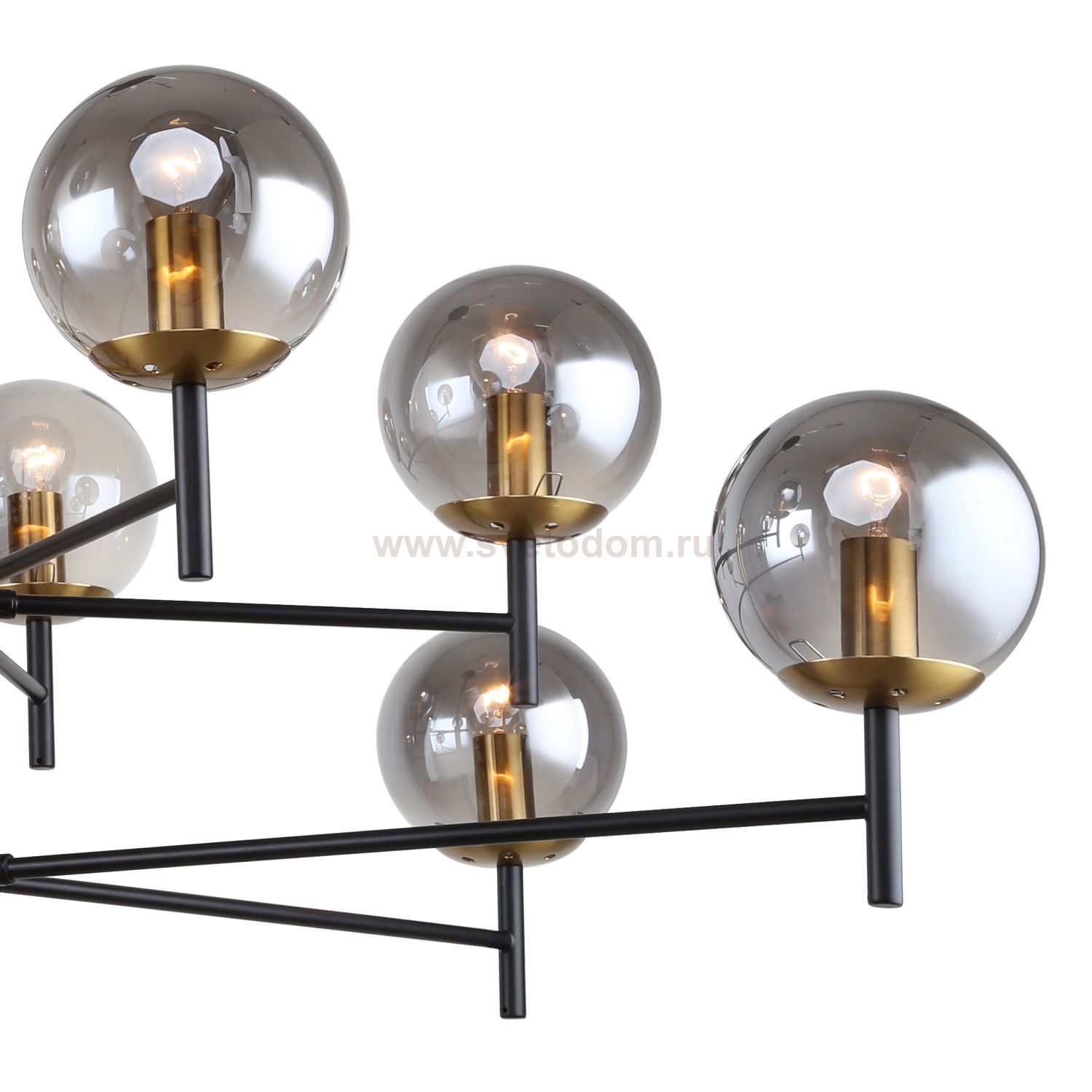 каркас черного цвета, плафоны из стекла дымчатого серого цвета, декоративный элемент из металла цвета латуни Цвет декора