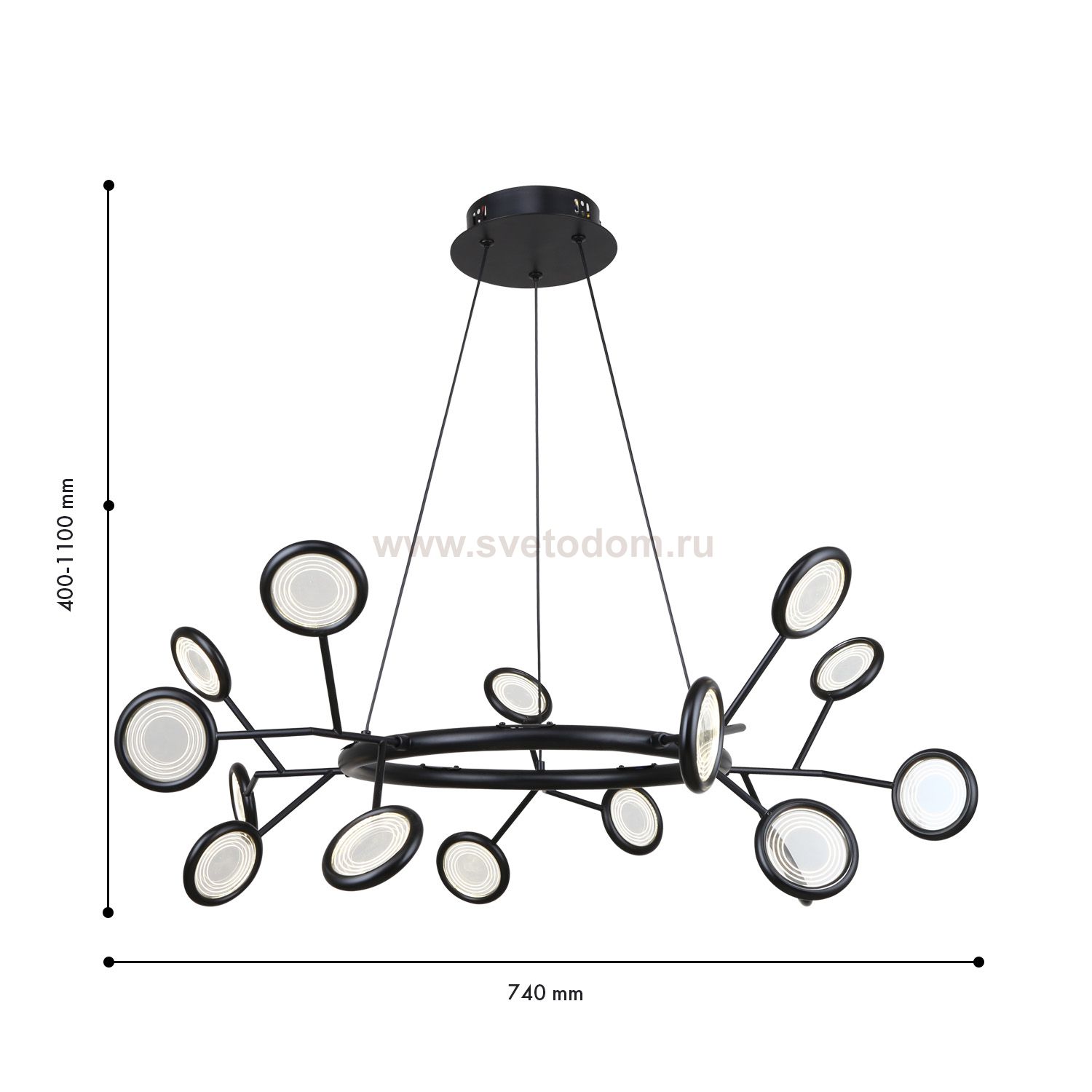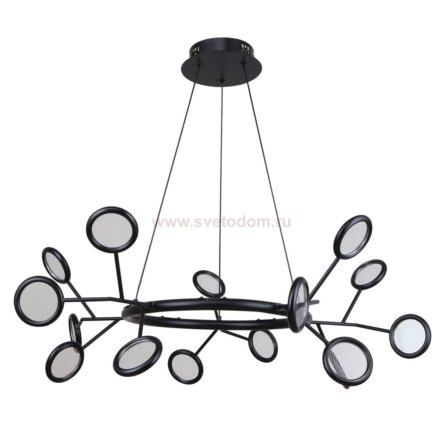Подвесная люстра с матовым черным каркасом, внутренний периметр плафонов подсвечен лентой-LED, 3D-эффект усиливается за счет нанесенного на акрил круг Серия