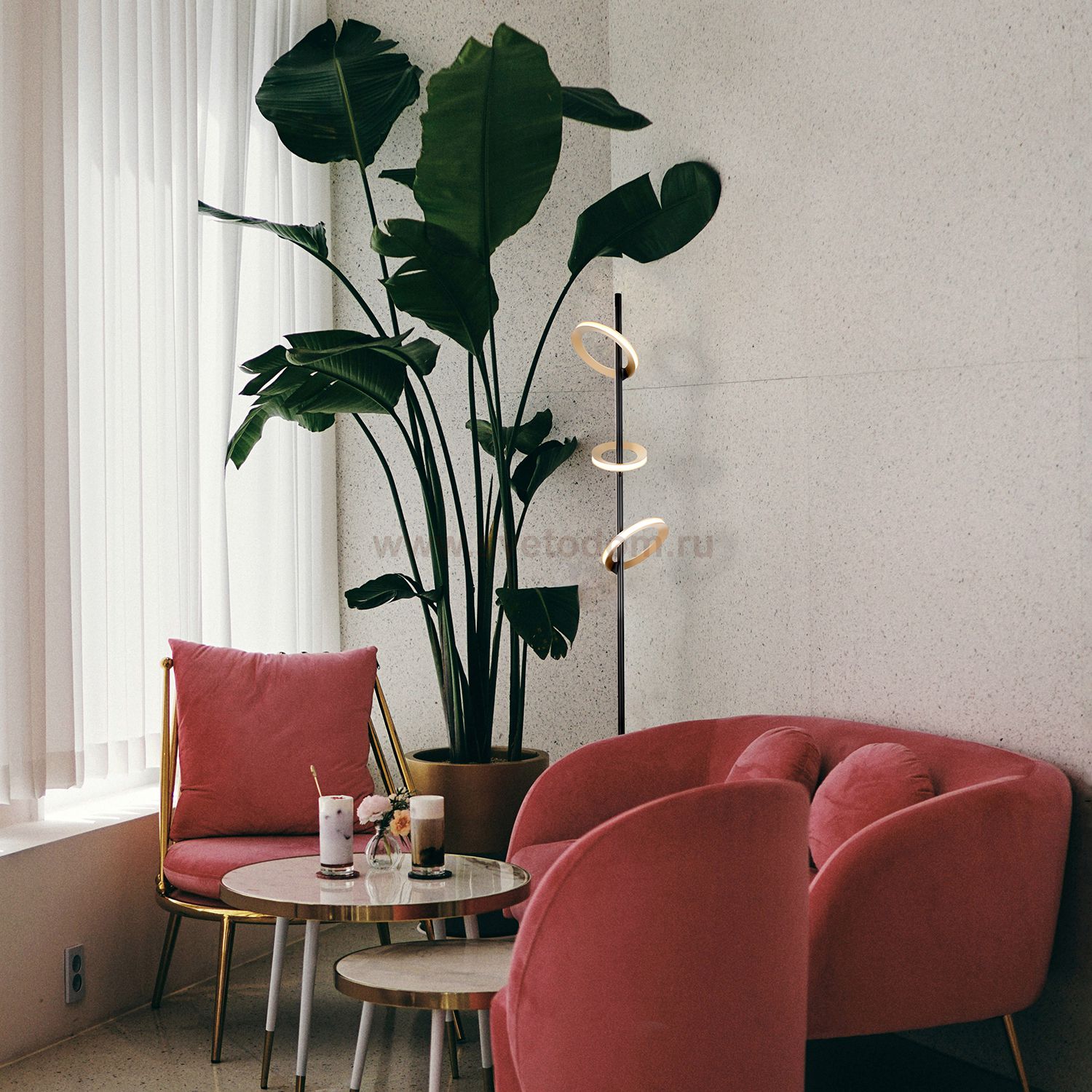 Торшер сочетает в себе объемные кольца цвета матовой латуни, которые светятся по периметру с помощью встроенной LED-ленты. Они закреплены под разным у Серия
