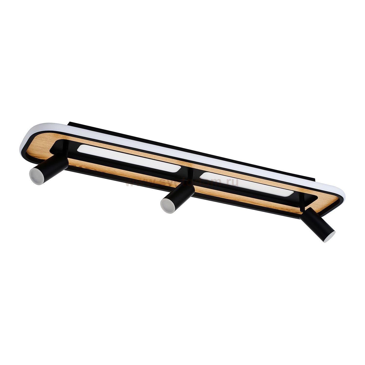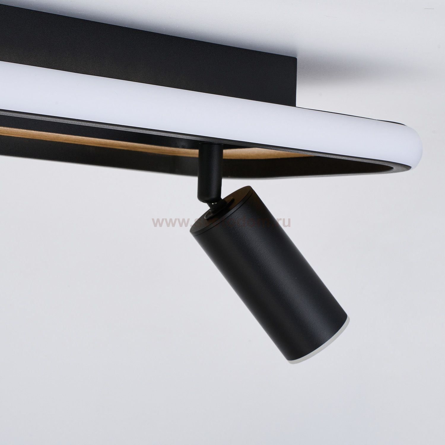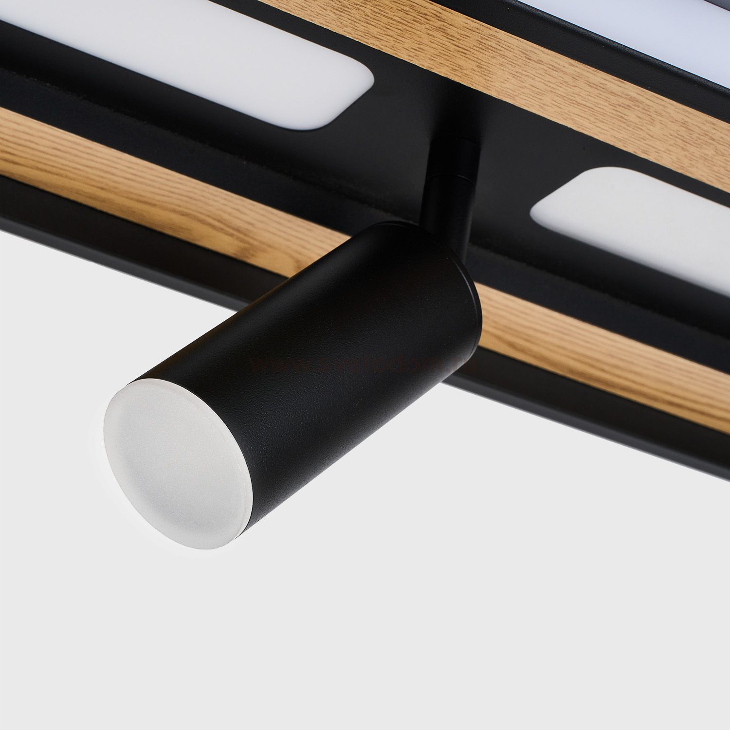 Декоративная вставка из МДФ с фактурой дерева на основании светильника, матовый черный каркас, LED-модуль, поворотные споты. Пульт дистанционного упра Серия
