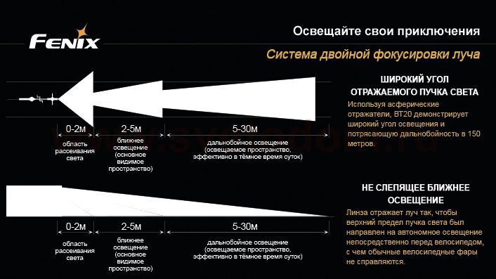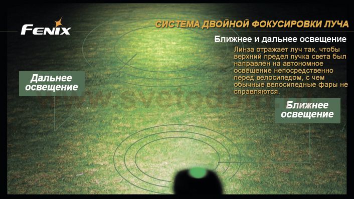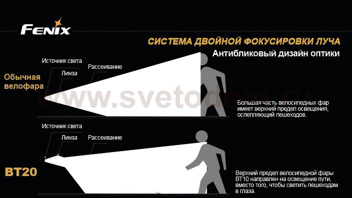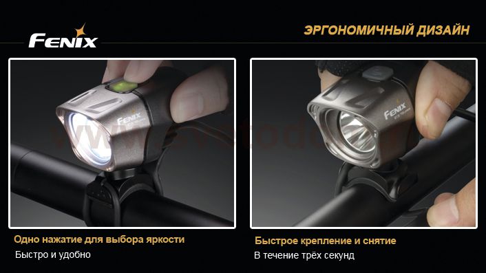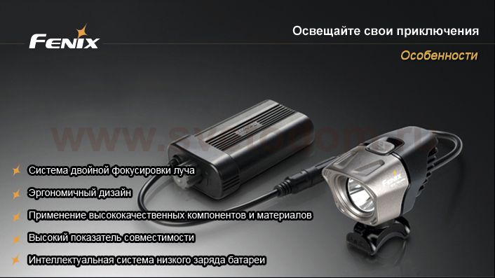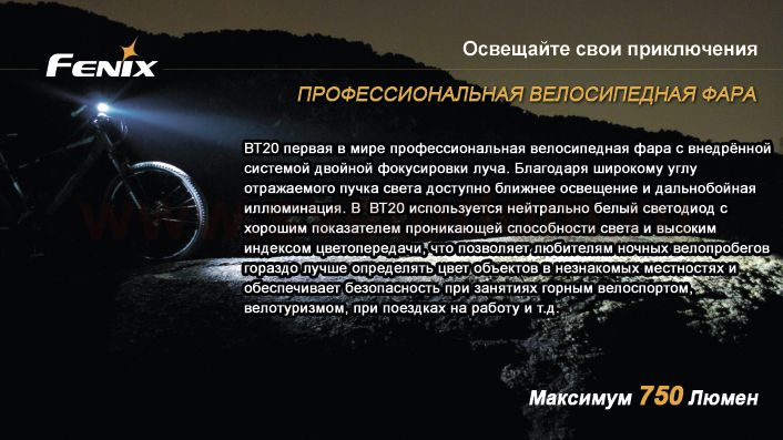 Одной из новых (и наиболее удачных!) разработок компании Fenix является велофара BT20 Cree XM-L (T6). В модели используется современный светодиод XM-L (T6) от американской компании Cree, который отличается пониженным потреблением энергии и повышенной световой отдачей. Оптическая система фонаря «Dual Distance Beam System» позволяет одновременно освещать дорогу на ближнем и дальнем расстоянии, не ослепляя встречных пешеходов. В велофаре реализовано четыре режима яркости, которые переключаются кнопкой на корпусе фонаря: 750 лм (время работы 1 час 45 минут), 450 лм (3 часа 45 минут), 300 лм (6 часов 20 минут) и 100 лм (19 часов 30 минут). Также в фонаре реализован режим стробоскопа, который имеет мощность светового луча 300 лм. Максимальная дистанция, на которой фонарь может осветить пространство, составляет 156 метров. Питание модели производится от выносного блока (в котором расположено четыре элемента стандарта CR123A или два 18650), соединенного с фонарем кабелем. В комплект входят три резиновых кольца разного диаметра, позволяющие установить фару на рули разного диаметра (30-35 мм, 24-30 мм, 20-24 мм), кабель-удлинитель, чехол для блока питания и крепление к рюкзаку. |