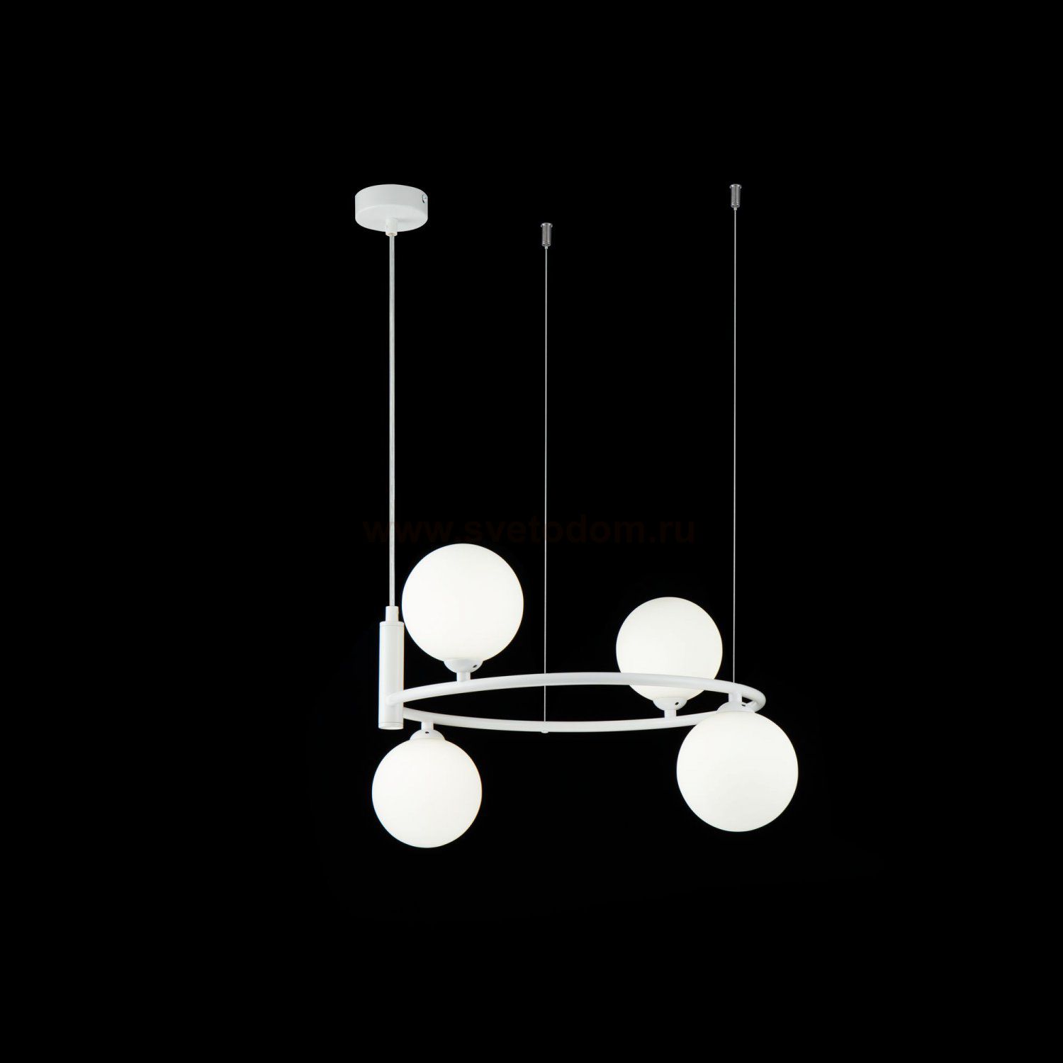 Каркас из металла. Модель представлена в 2-х цветах. Плафоны из белого матового стекла. Светильник крепится на 3-х тросах (модели MOD013PL-04W/B). Комментарий