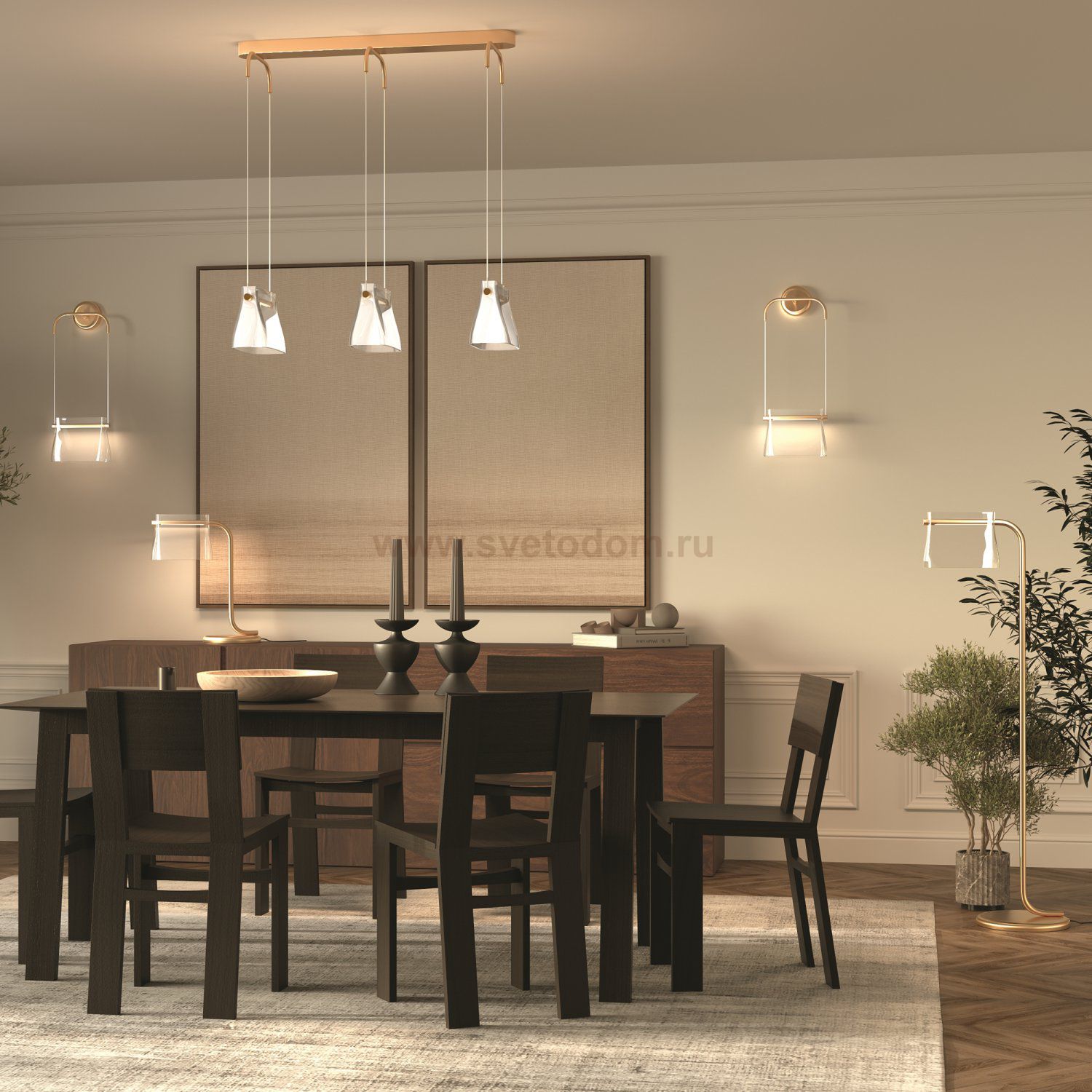 Цвет металлической арматуры — латунь с сатинированным финишем, плафоны — прозрачное стекло. Источник света: LED. Цветовая температура светильников 3000К, угол рассеивания — 120 градусов. Настенные бра и подвесные светильники оснащены регулируемым проводом длиной до 3 метров, что позволяет использовать их в помещениях с высокими потолками.