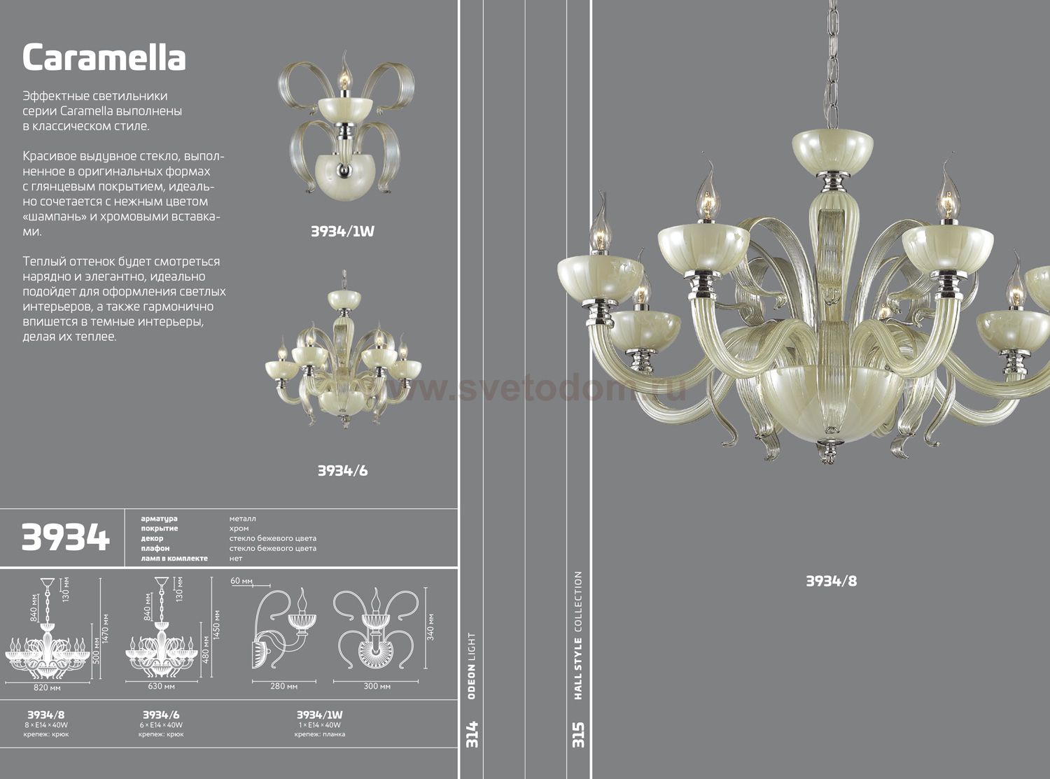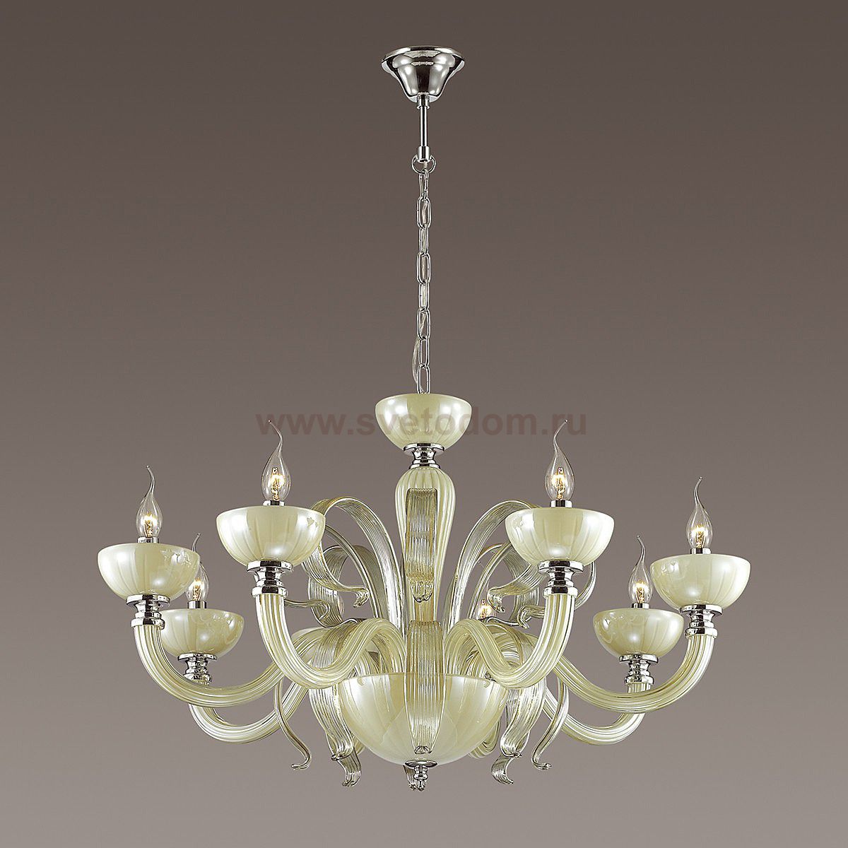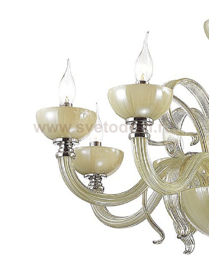 Эффектная люстра 3934/8 серии Caramella выполнена в классическом стиле. Красивое выдувное стекло, выполненное в оригинальных формах и с глянцевым покрытием, идеально сочетается с нежным цветом "шампань" и хромовыми вставками. Теплый оттенок люстры будет смотреться нарядно и элегантно, идеально подойдет для оформления светлых интерьеров, а также гармонично впишется в темные интерьеры, делая их теплее. Цоколь E14. Мощность 8*40W. Нет ламп в комплекте.