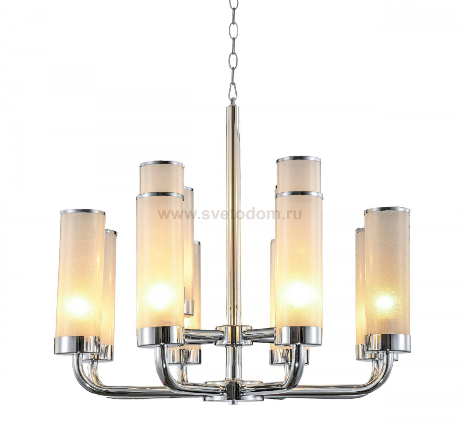 Модель содержит 12 цоколей, ориентированных вверх и рассчитанных на подключение лампочек мощностью 25 Вт. Матовые плафоны выполнены в виде узких высоких цилиндров и декорированы по краям серебряной окантовкой.