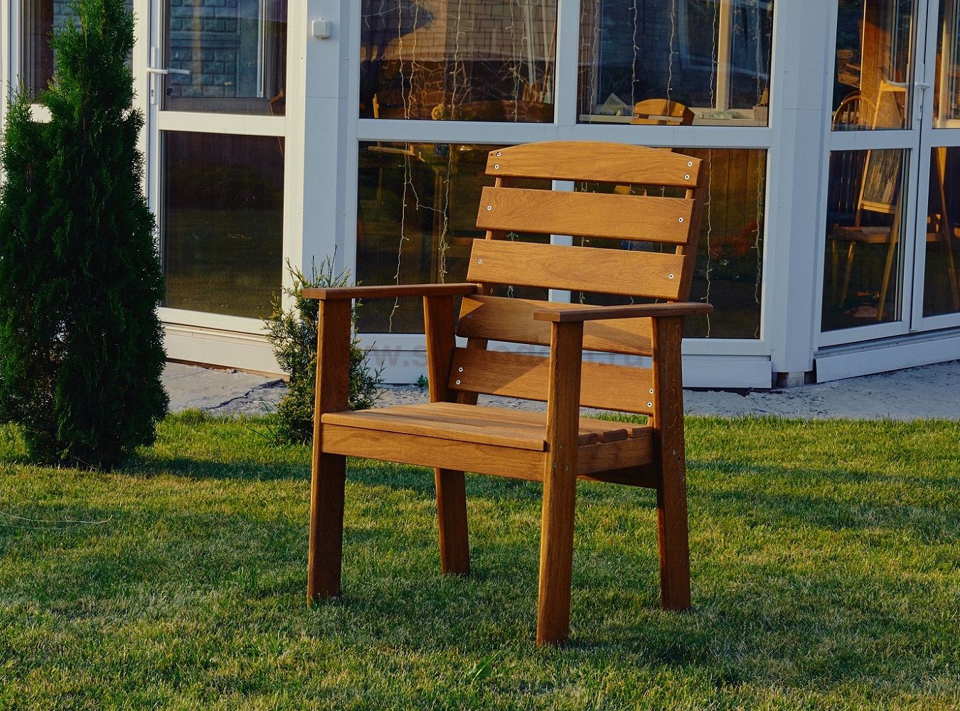 Стул производится из массива дуба. Проходит термическую обработку и пропитку в экологически чистом масле с содержанием 30% парафина, применяемого в косметической отрасли. Эта технология не дает возможности проникать в древесину атмосферной влаге или прямого попадания воды(дождя). Мебель имеет натуральный цвет с хорошо выраженной структурой. Дополнительно не покрывается никакими красителями или пропитками.