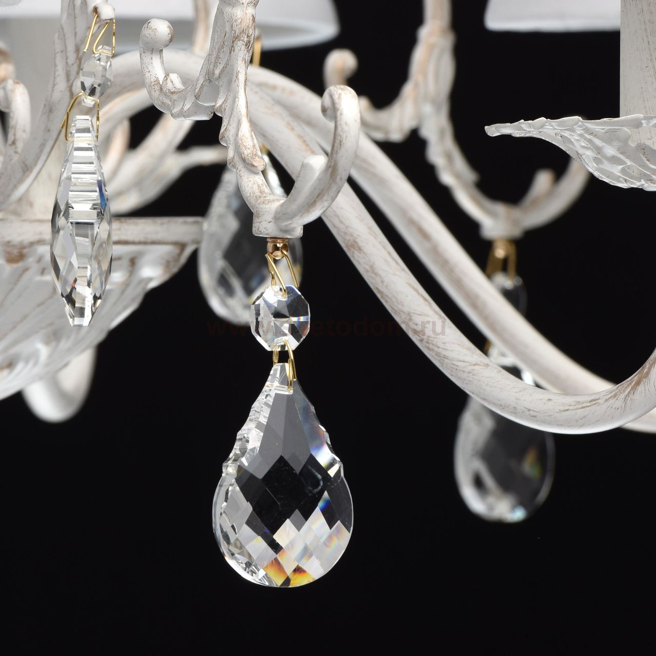 Металлическое основание окрашенное в белый цвет с золотистой патиной. Плафоны: текстиль белого цвета. Декор - хрусталь Материал плафона