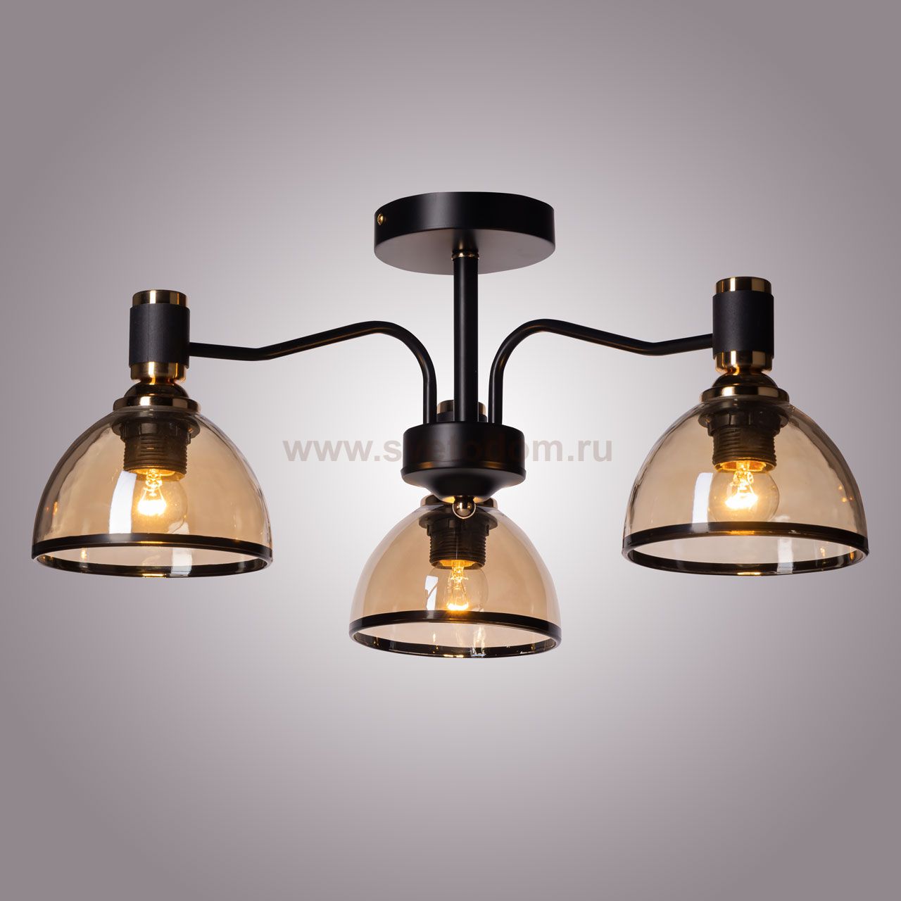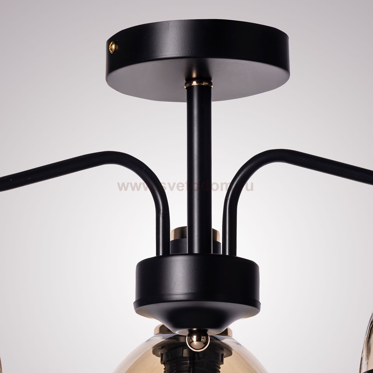 Металлическое основание потолочной люстры окрашено в черный цвет. Отдельные элементы основания гальванизированы в цвет золота. Потолочная люстра декорирована стеклянными плафонами, гальванизированными в цвет коньяк. Плафоны отделаны металлическим кантом черного цвета. Комментарий