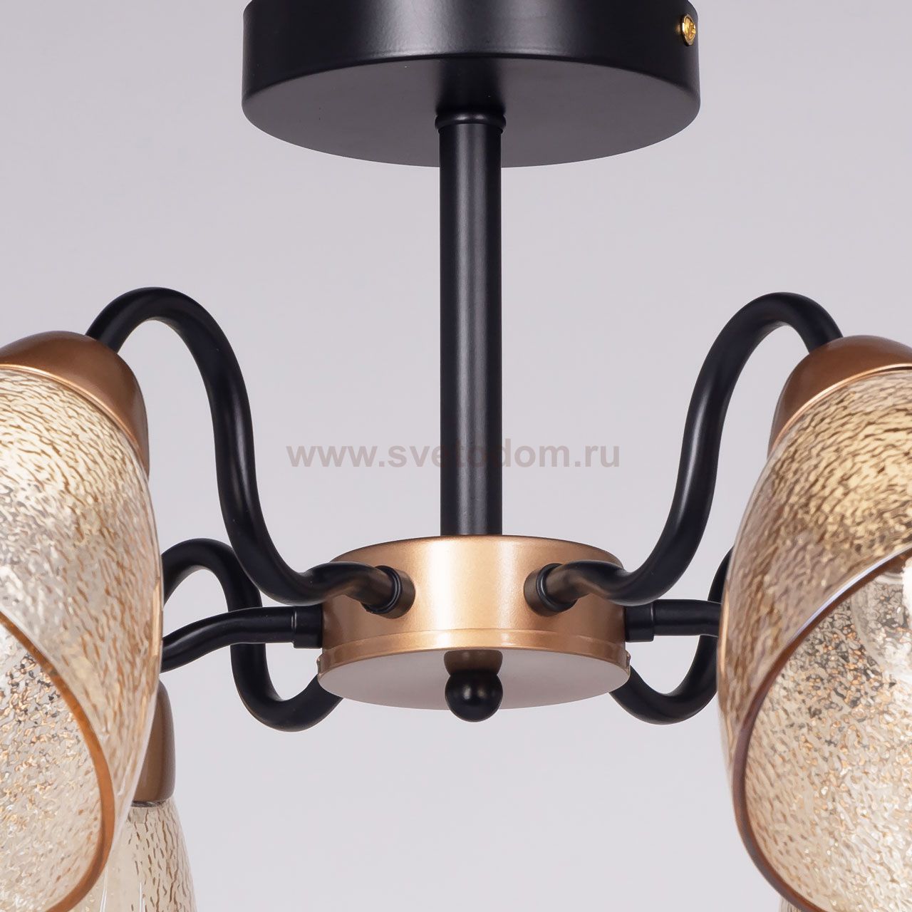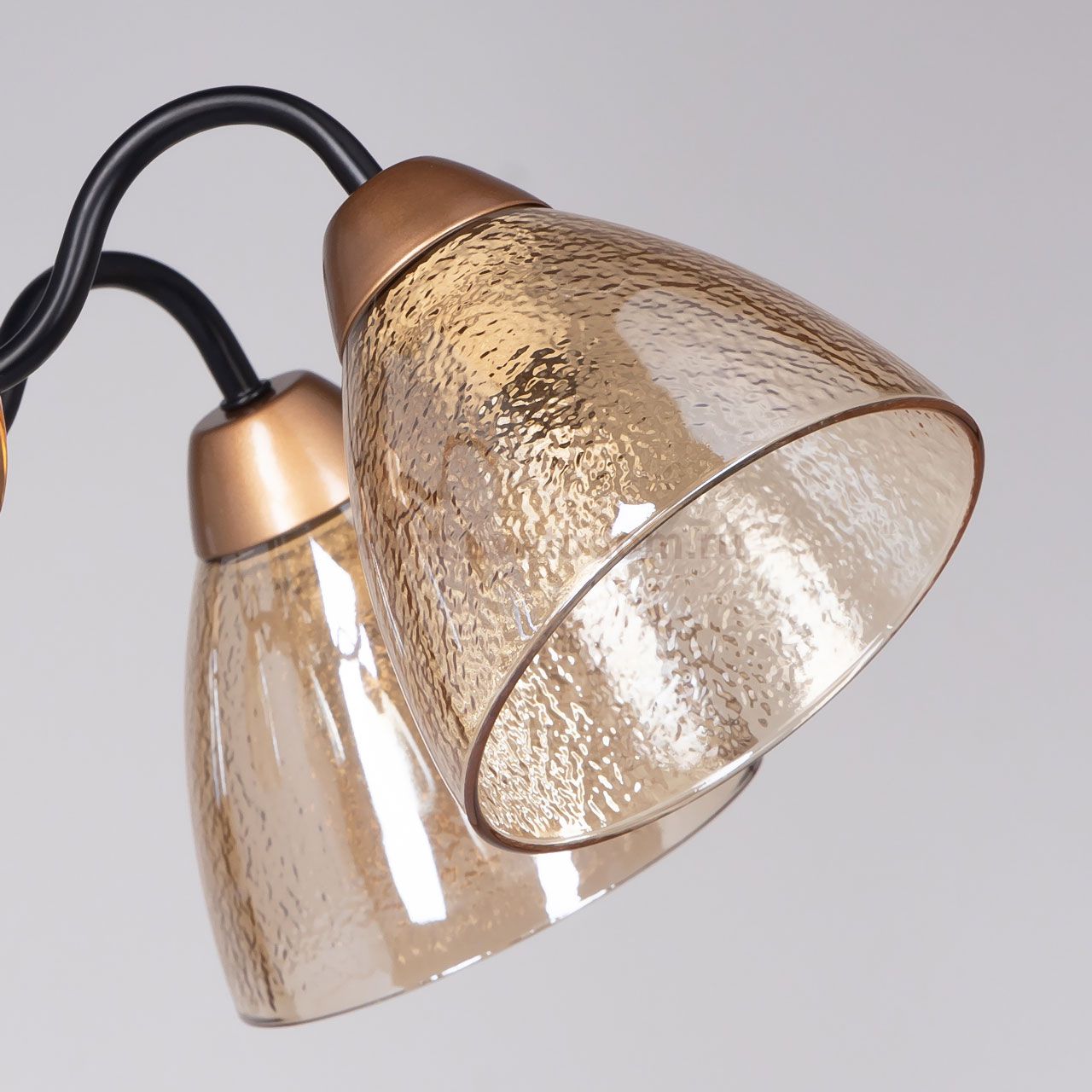 Металлическое основание потолочной люстры окрашено в черный цвет. Отдельные элементы основания гальванизированы в цвет золота. Потолочная люстра декорирована плафонами из фактурного стекла, гальванизированного в цвет коньяк. Комментарий