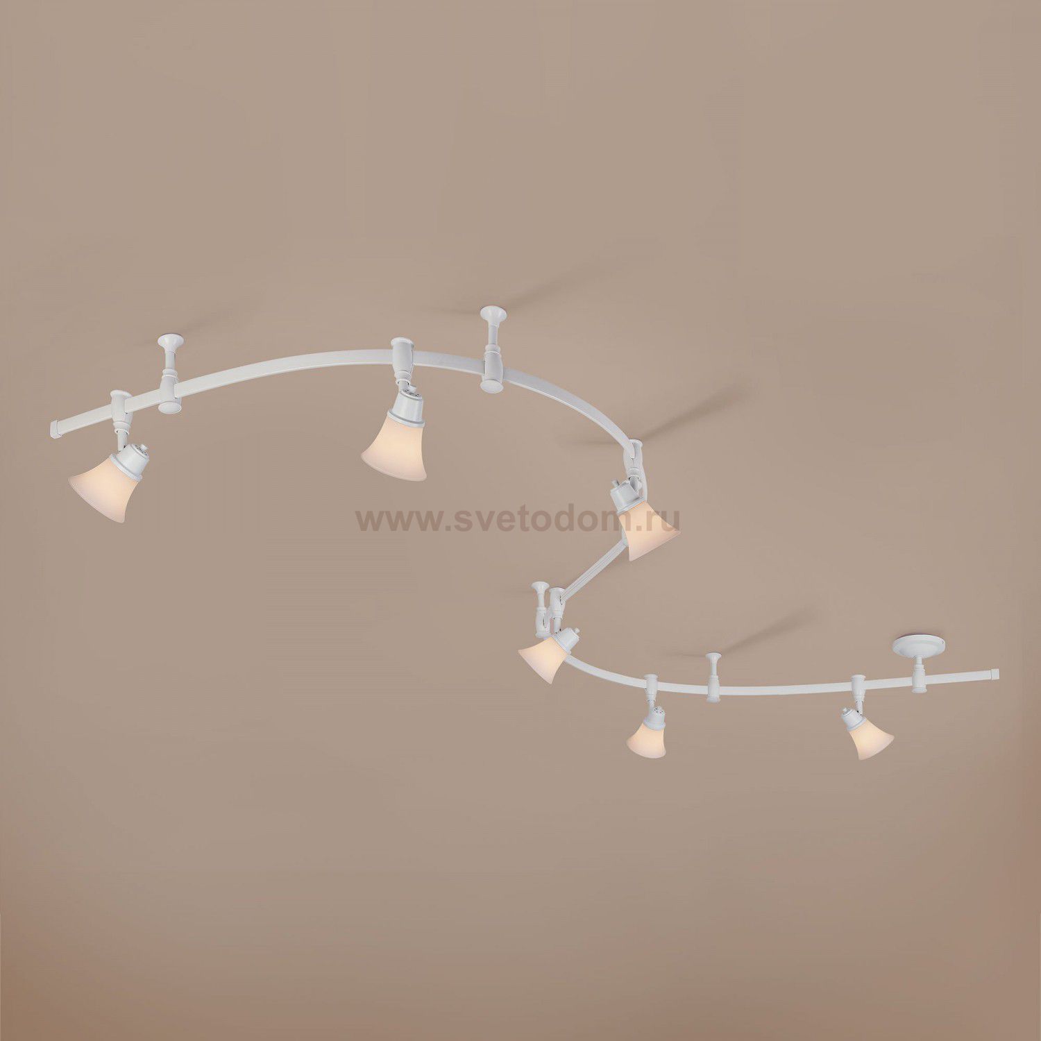 Трековая система 220V на гибкой шине длиной 300см, в комплекте 6 стоек крепления шины и 6 головок, размер головки 12см, лампы Е14 или R50, Белое стекло и современный дизайн Штрих-код