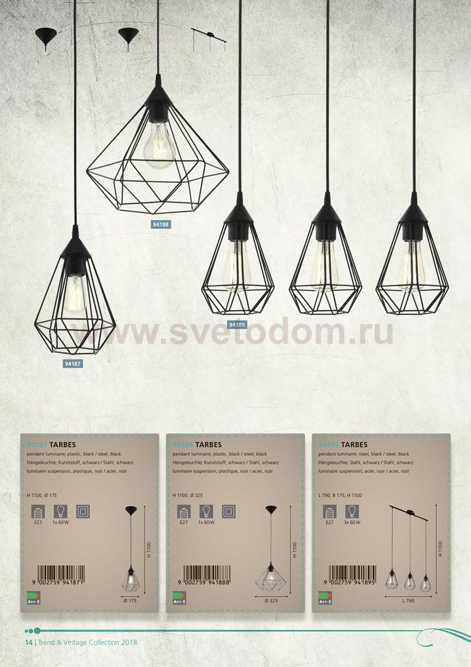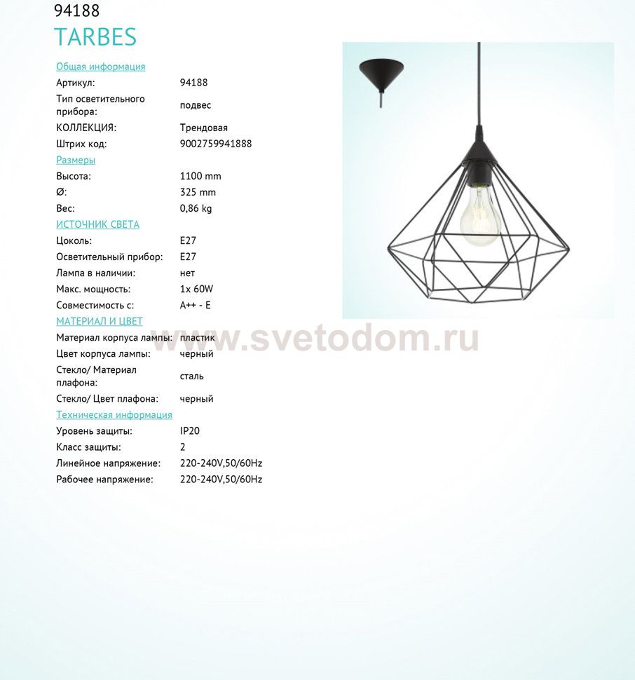 82 Отзывы Подвесный светильник Eglo 94188 TARBESПока нет отзывов об этом товаре, напишите и он обязательно появится после модерации! Оставить свой отзывДругие товары магазина Фото