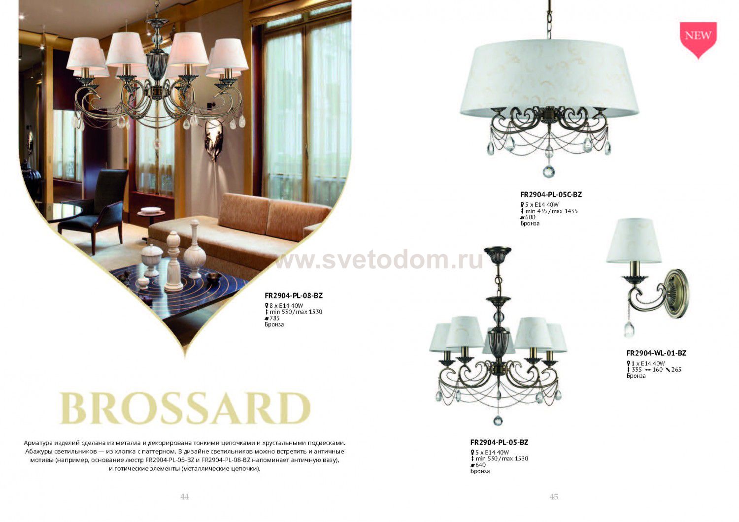 Арматура изделий сделана из металла и декорирована тонкими цепочками и подвесками. Абажуры светильников из хлопка с паттерном. В дизайне светильников можно встретить и античные мотивы (например, основания люстр FR2904-PL-05-BZ и FR2904-PL-08-BZ напоминают античную вазу), и готические элементы (металлические цепочки).