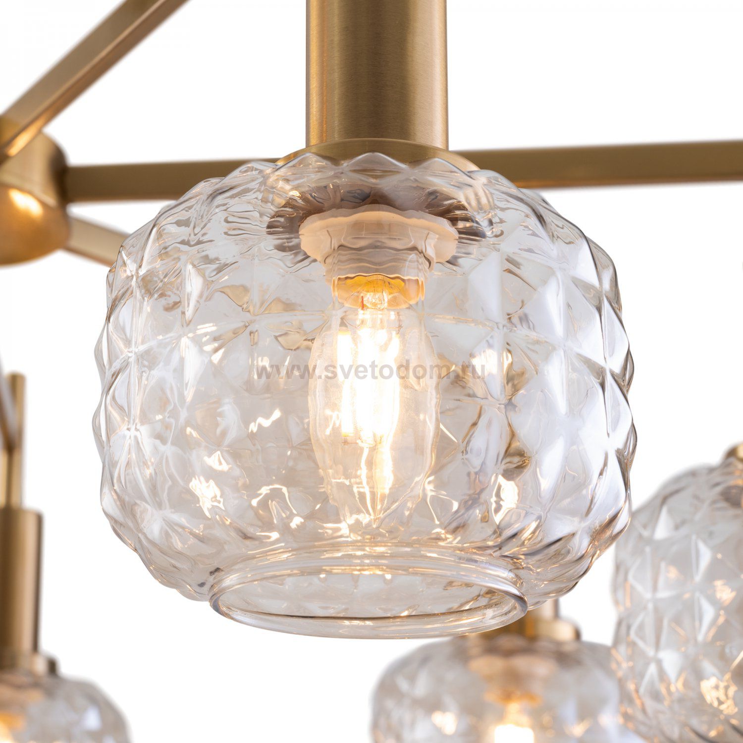 Металлическая арматура в цвете латунь. Плафоны из толстого рельефного стекла в оттенке амбра с «шипованной» огранкой. Подвесные модели регулируется по высоте. Источник света - лампа с цоколем Е14