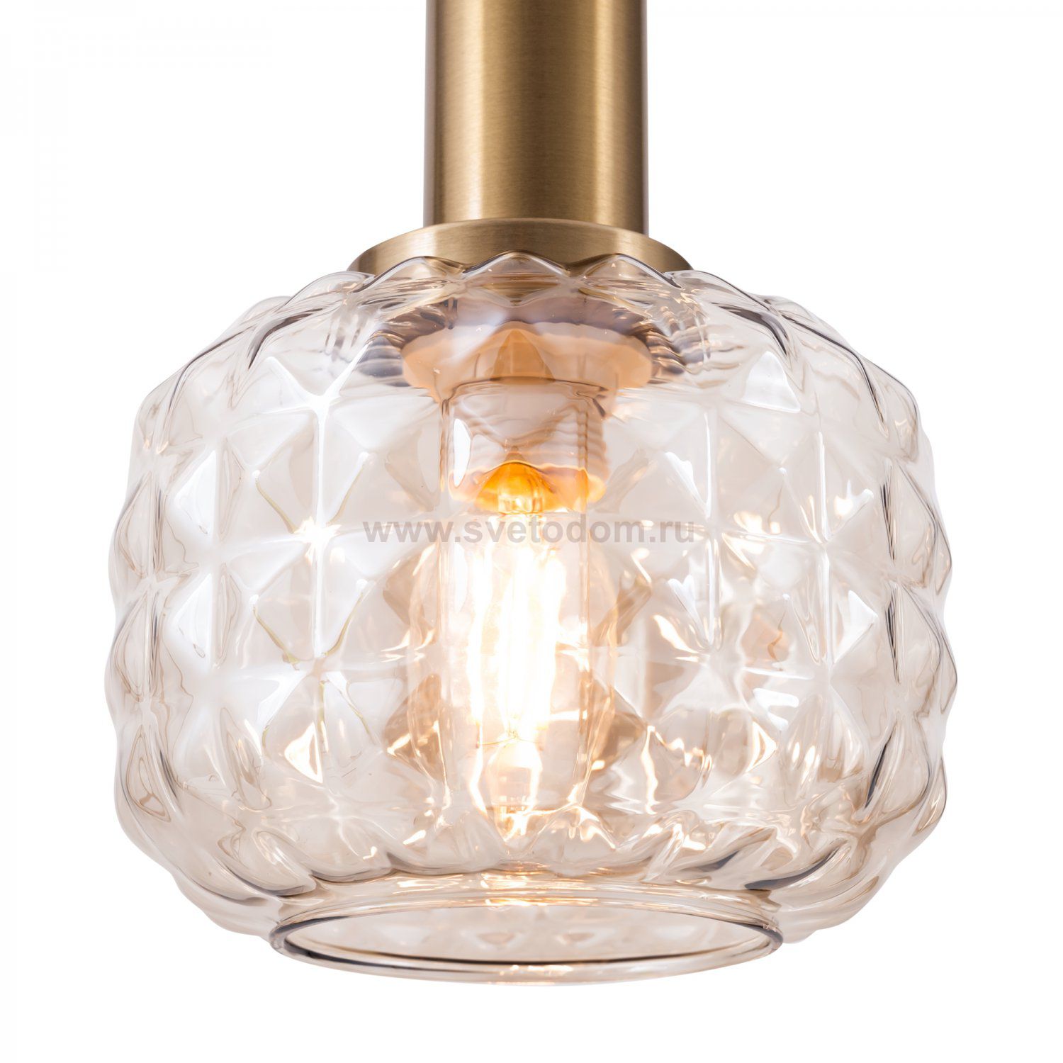 Металлическая арматура в цвете латунь. Плафоны из толстого рельефного стекла в оттенке амбра с «шипованной» огранкой. Подвесные модели регулируется по высоте. Источник света - лампа с цоколем Е14