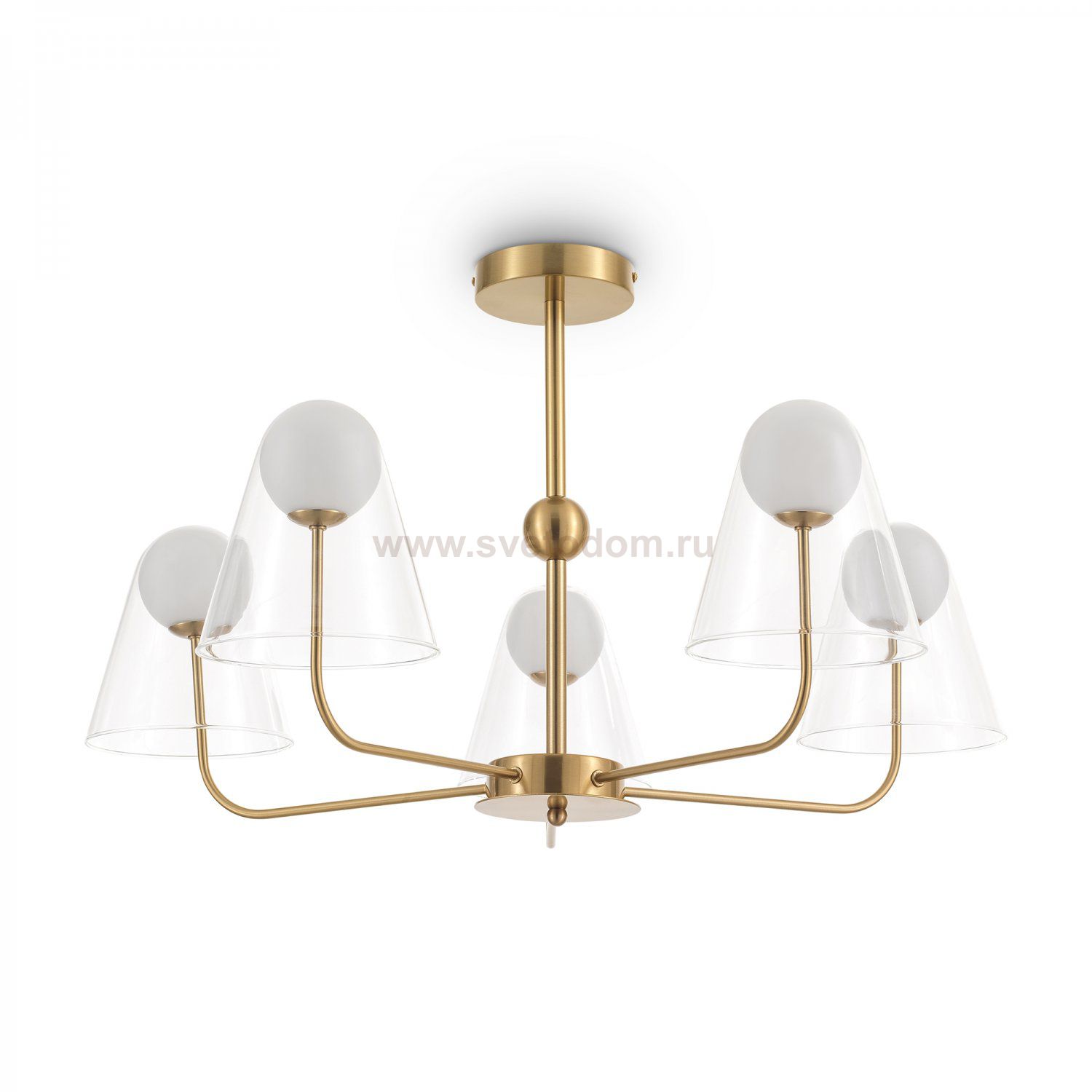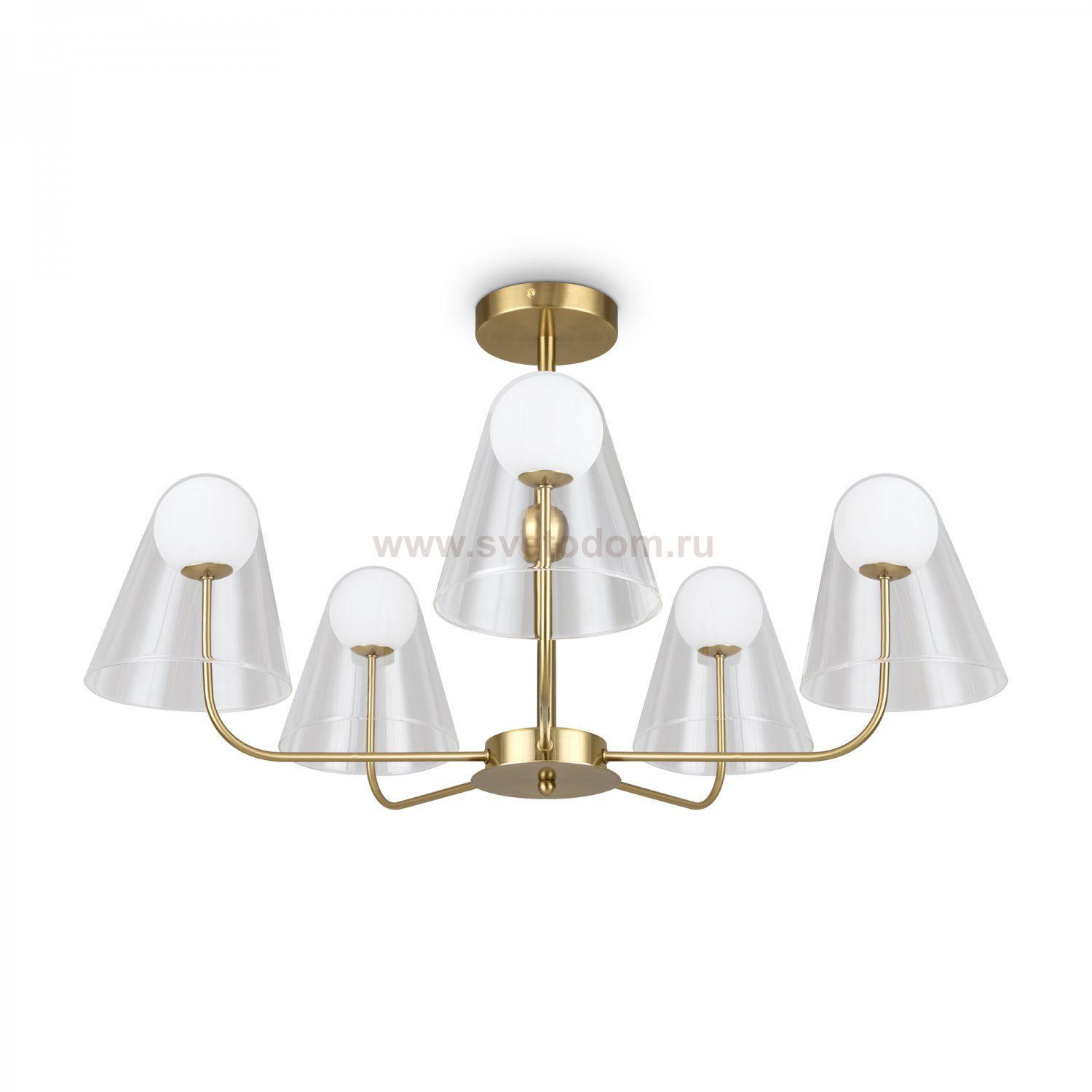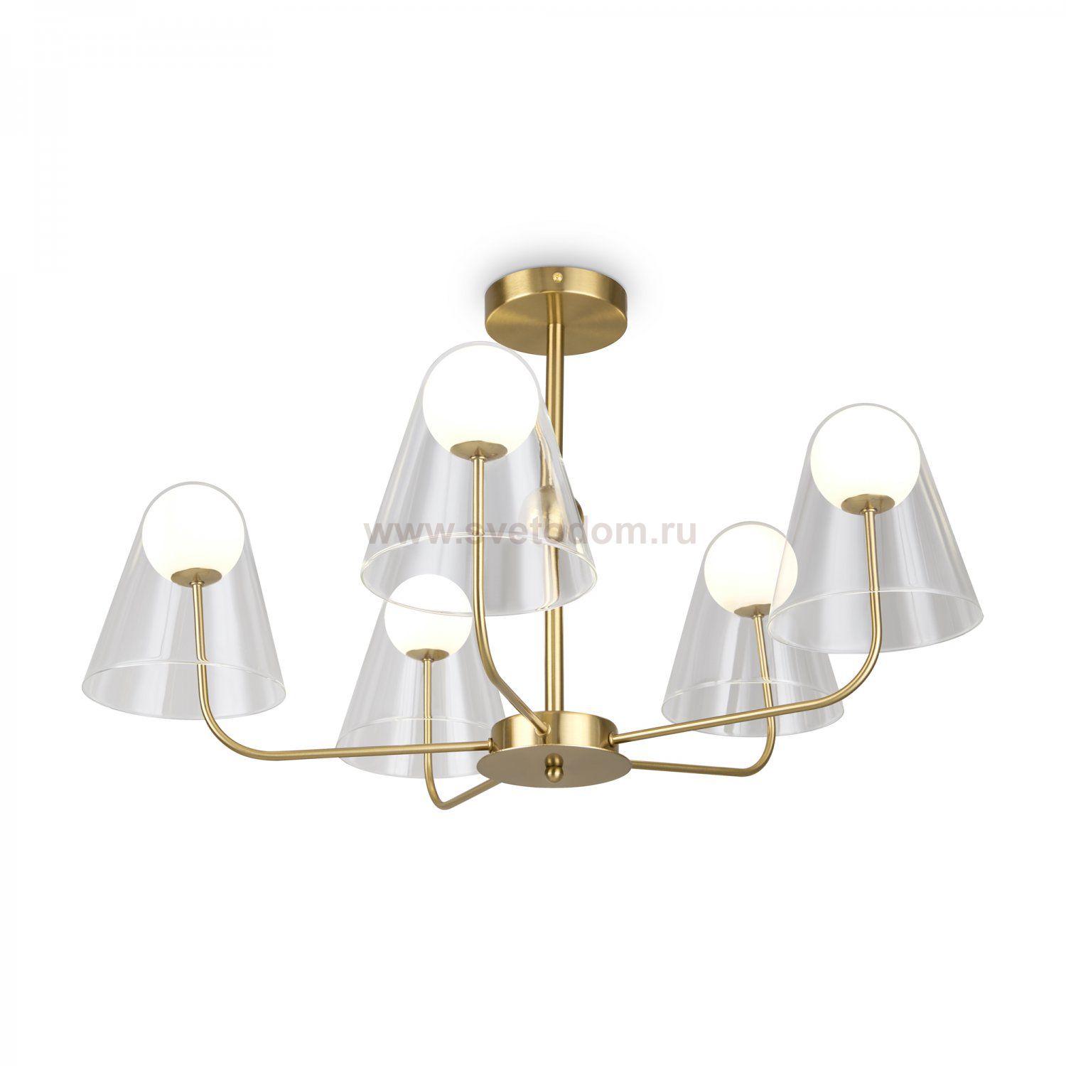 Арматура — металл, цвет — латунь. Двойные плафоны из стекла. Внешний — прозрачный в форме конуса плавно обрамляет контуры внутреннего матового сферического плафона. Свежий взгляд в дизайне на комбинацию форм и фактур. Источником света служит лампа с цоколем G9.