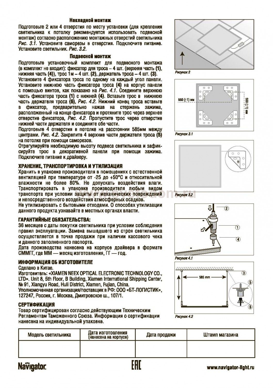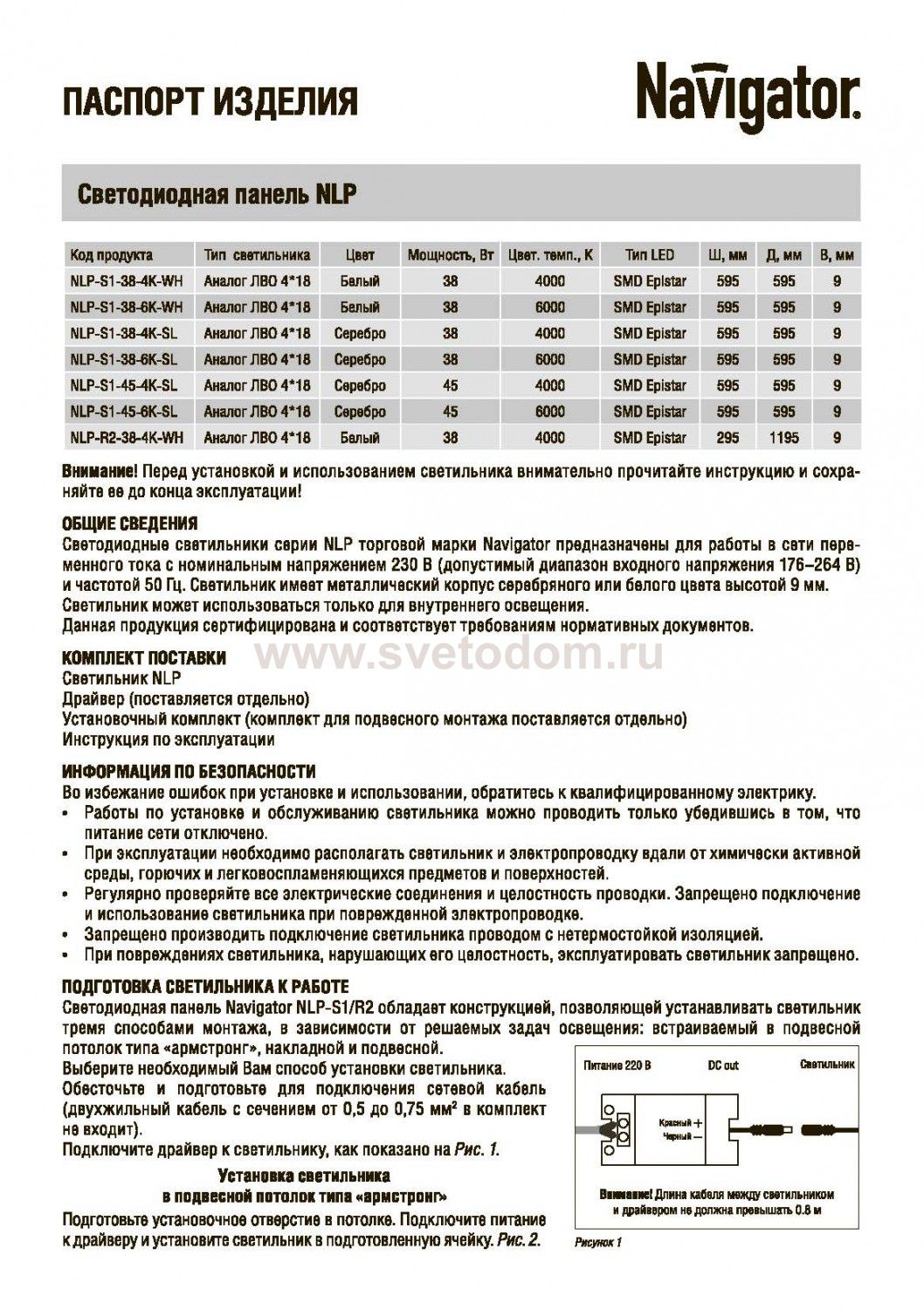 Светодиодная ультратонкая панель NLP-S1 предназначена для освещения внутри помещений. Создает яркий равномерный свет и обладает компактными размерами, что делает данный светильник идеальным решением любых задач по освещению и световому дизайну. Светодиодная панель Navigator NLP-S1 обладает конструкцией, позволяющей устанавливать светильник тремя способами монтажа, в зависимости от решаемых задач освещения: встраиваемый в подвесной потолок типа «армстронг», накладной и подвесной. В светодиодной панели Navigator NLP-S1 применяется композитный рассеиватель на основе ПММА и акрила, что обеспечивает равномерное распределение света. В светильнике NLP-S1 применяется высокоэффективный драйвер (cos φ>0.95), построенный на интегральной микросхеме, обеспечивающий стабильную работу без пульсаций светового потока в широком диапазоне входных напряжений (180–260 В). В светодиодных светильниках NLP-S1 применяются высокоэффективные планарные светодиоды Epistar, обеспечивающие эффективность до 80 лм/Вт. При этом коэффициент цветопередачи обеспечивается на уровне Ra>80.