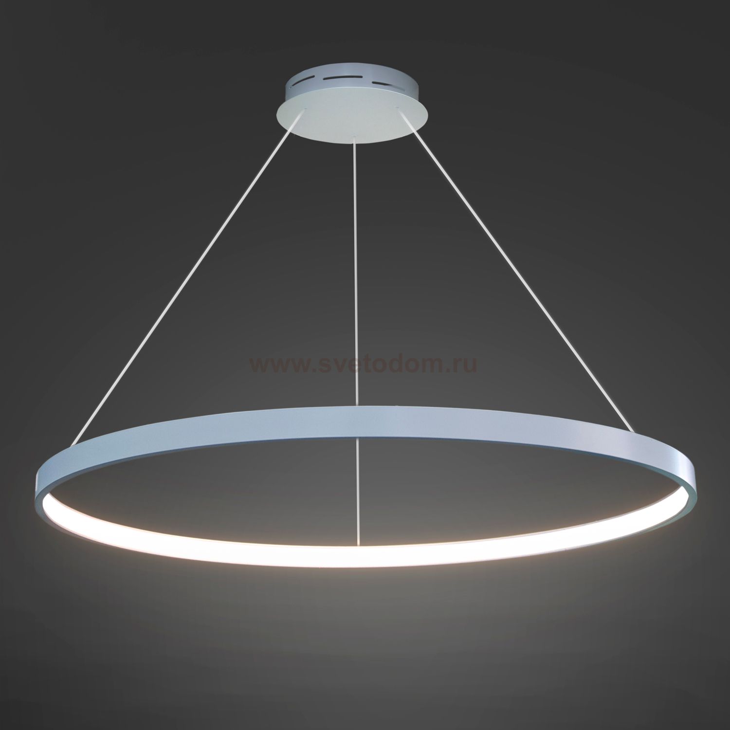 Стильная, современная люстра – светодиодный дизайнерский светильник в форме кольца. Подходит для интерьеров в стиле модерн, хайтек, лофт. Испускает тепло-белый яркий свет, похожий на солнышко, без выраженных пятен. Преимущества: 1. Надежный и долговечный: диоды расположены на алюминиевой плате, а не на ленте. 2. Прочный: основание и корпус и металла, а не из пластика. 3. Безопасный: нулевой коэффициент мерцания – благоприятно для зрения.