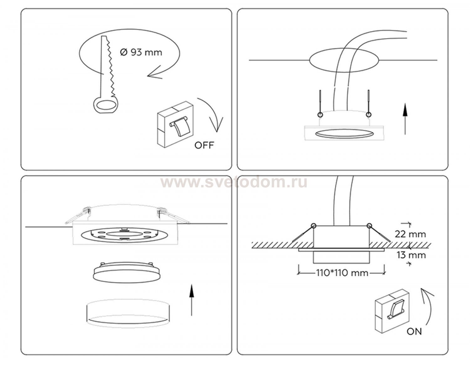 Данный размер указывает какое отверстие необходимо сделать для правильного монтажа. Зачастую светильники выбирают после ремонта и сделанных монтажных отверстий, тогда подбор осуществляется строго в размер +/- 2-5мм.