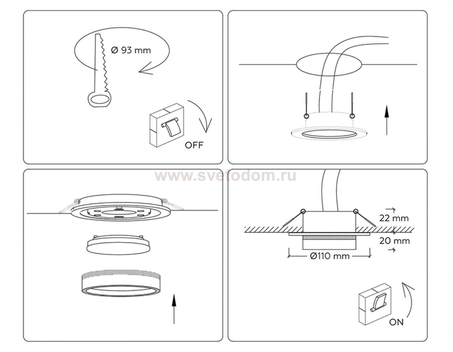 Данный размер указывает какое отверстие необходимо сделать для правильного монтажа. Зачастую светильники выбирают после ремонта и сделанных монтажных отверстий, тогда подбор осуществляется строго в размер +/- 2-5мм.
