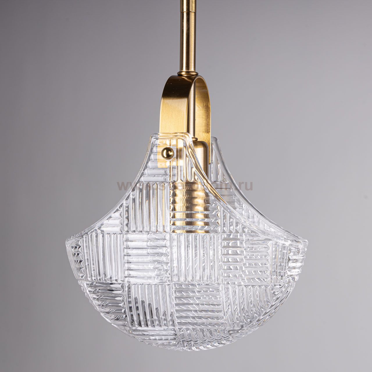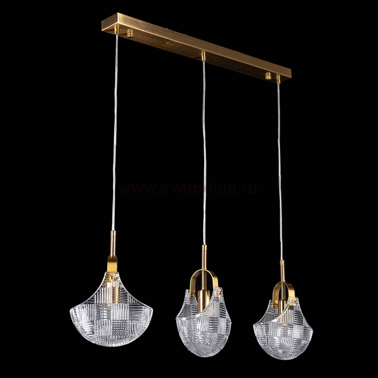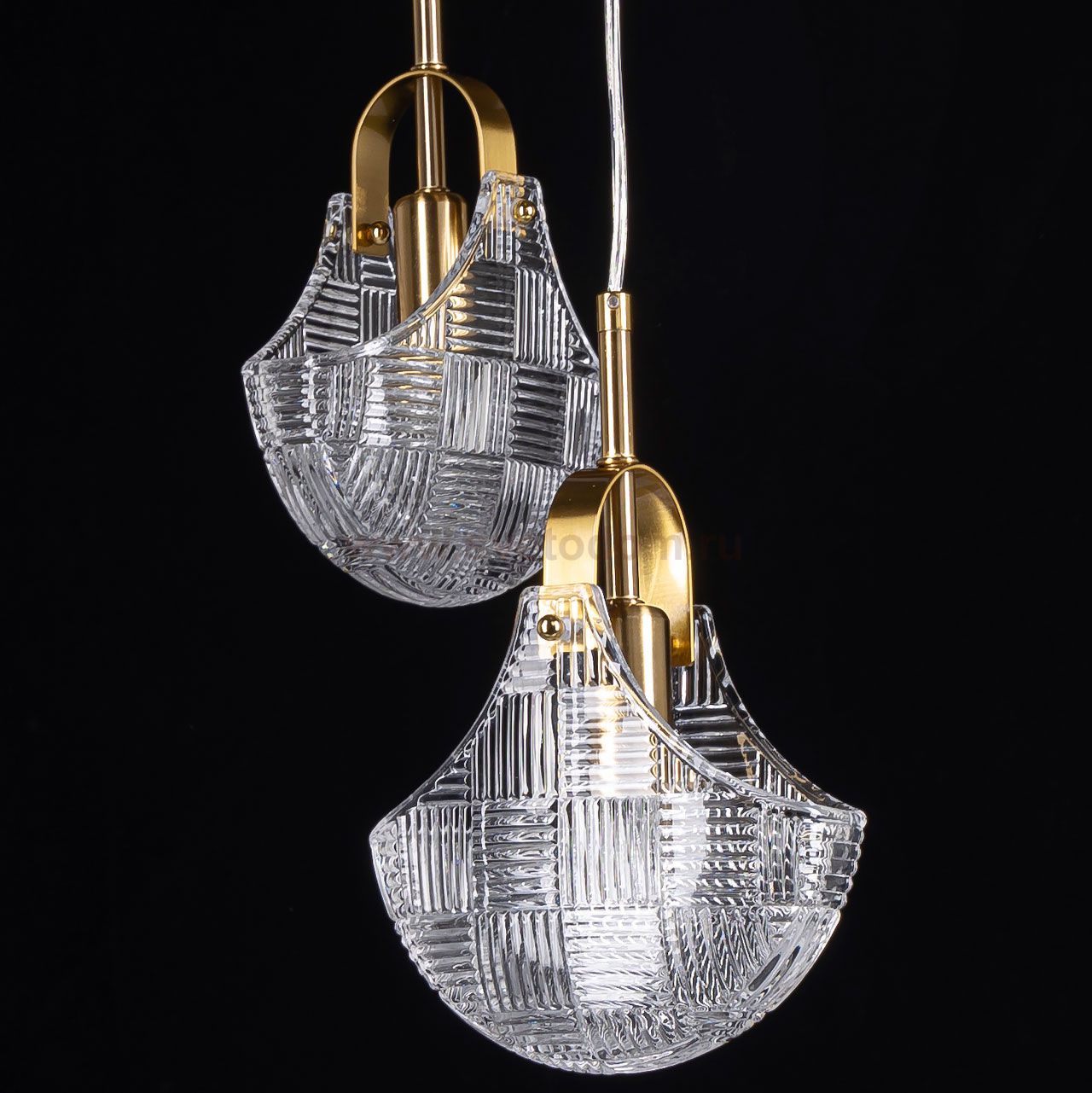 Металлическое основание люстры гальванизировано в цвет бронзы. Подвесной светильник декорирован плафонами оригинальной формы из прозрачного фактурного стекла, отлитого в сложную форму. Комментарий