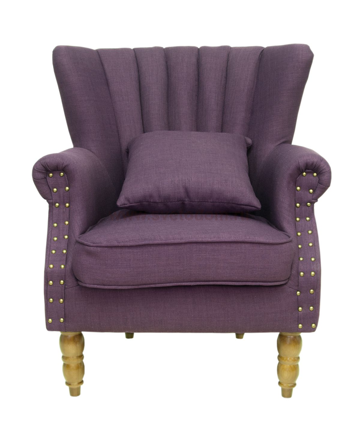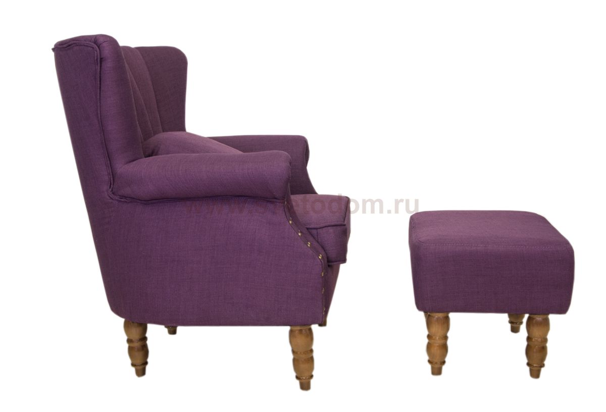Кресло Lab сиреневого цвета на резных ножках выполнено в оригинальном дизайне. Прочный каркас создан из дерева, в качестве обивки использована ткань из натурального льна. Высокая спинка с продольной объемной стежкой, широкое сиденье и мягкие подлокотники обеспечивают телу удобное положение, способствуют полному расслаблению при отдыхе. Модель поставляется в комплекте с дополнительной подушкой и пуфом, выполненном в том же стиле.