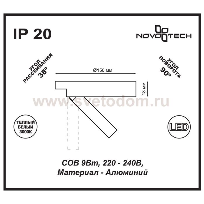 Данное значение указывает угол поворота, на который может поворачиваться светильник или угол рассеивания, на который светит лампа