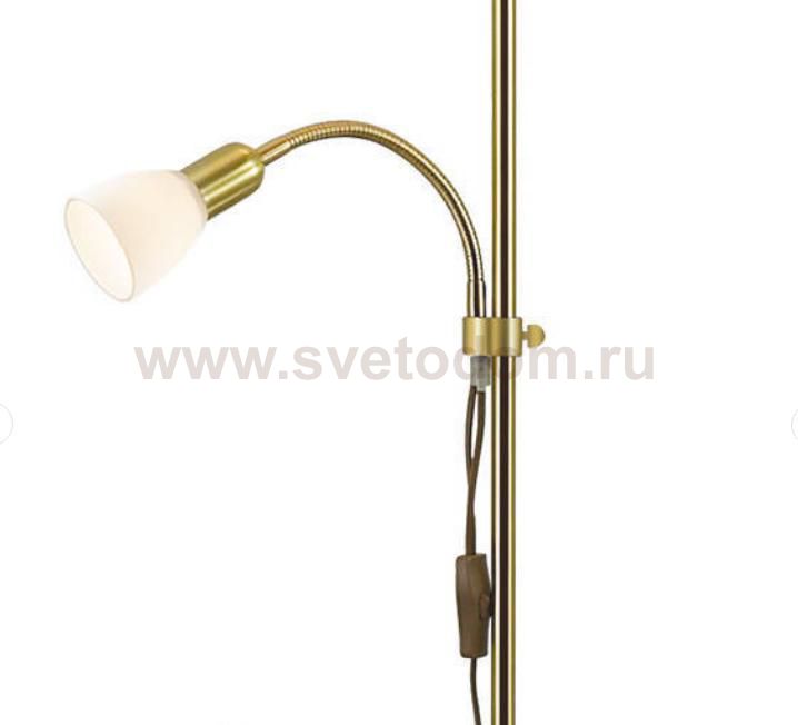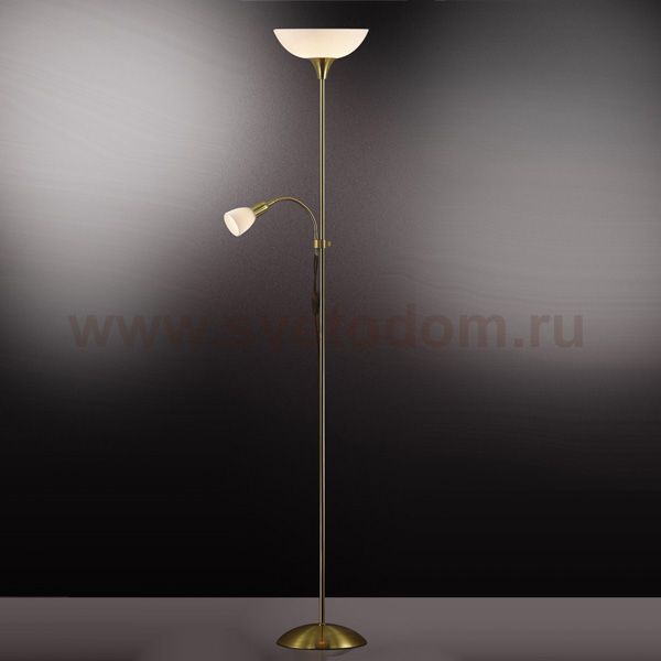 Торшер 2712/F линии Trend выполнен в стиле модерн и состоит из металлического основания цвета матовое золото, и двух плафонов: верхнего из белого пластика и бокового из матового стекла. У каждого плафона имеется свой выключатель. Цоколь E27/E14. Мощность 100W+40W. Нет ламп в комплекте.