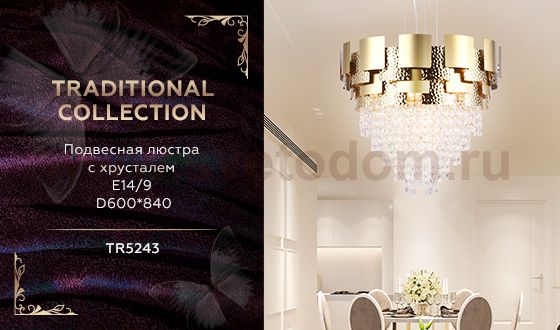 Подвесная люстра из коллекции TRADITIONAL. Модель TR5243 представлена в современном стиле Арт-деко. Светильник круглой формы, выполнен в золотом цвете, с превосходным прозрачным хрусталем, каркас изготовлен из металла. Для данной модели подойдут лампы с цоколем Е14. Светильник будет прекрасным дополнением в гостиной или спальне.