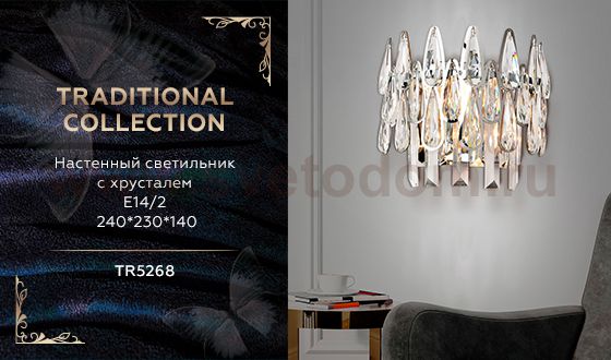 Настенный светильник из коллекции TRADITIONAL. Модель TR5268 представлена в современном стиле Арт-деко. Светильник оригинальной формы, выполнен из превосходного прозрачного хрусталя, каркас выполнен из металла цвета хром. Для данной модели подойдут лампы с цоколем Е14. Светильник будет прекрасным дополнением в любом помещении.