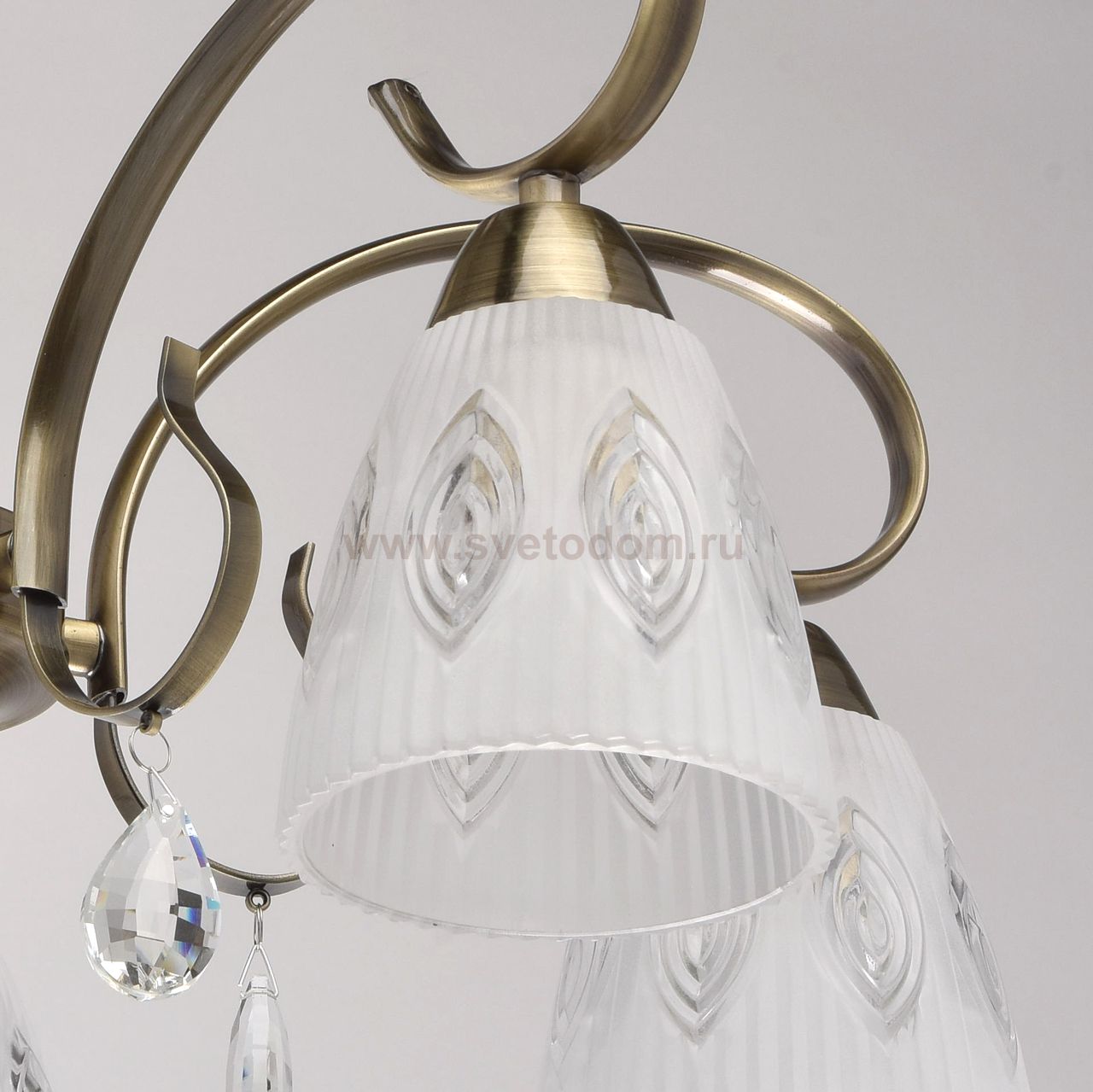 Основание выполнено из облегченной стали, гальванизировано в цвет античной бронзы. Плафоны: матовое белое стекло. Декор: подвески из хрустального стекла. Комментарий