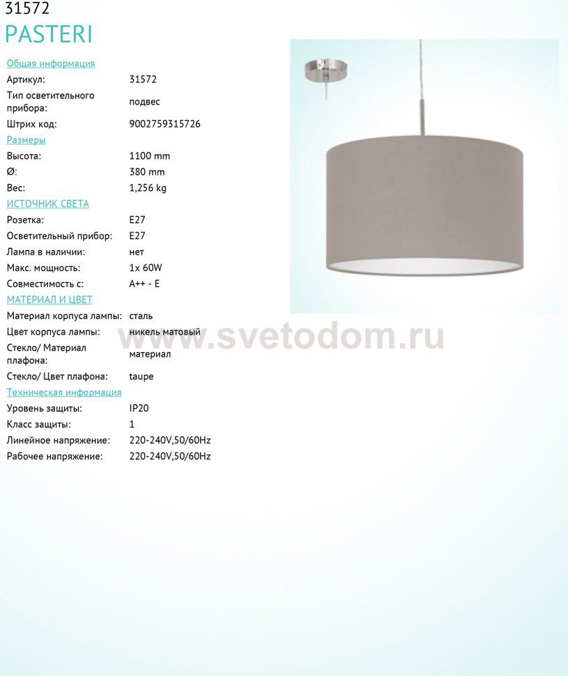 Текстильный светильник Eglo 31572 PASTERI