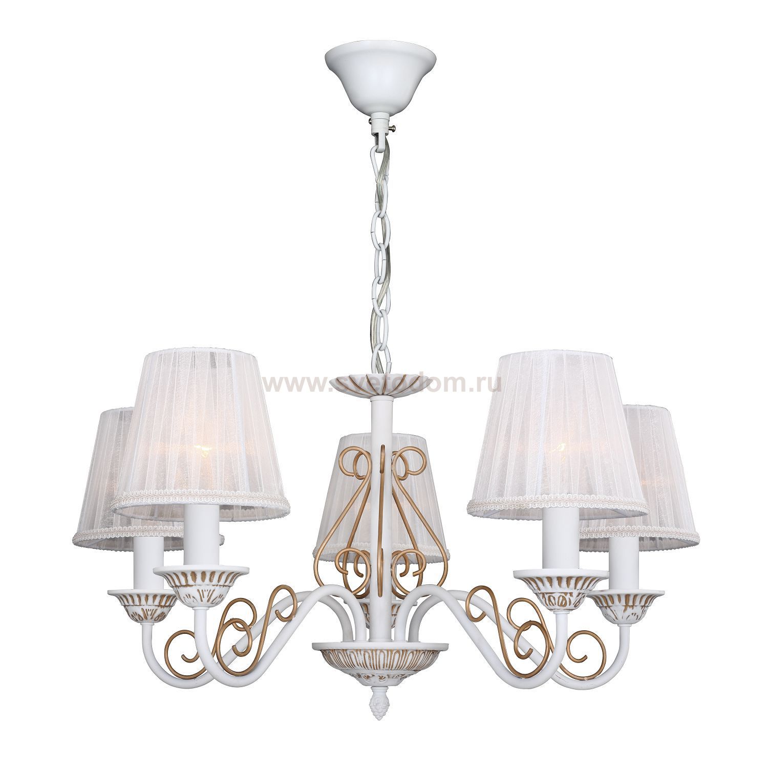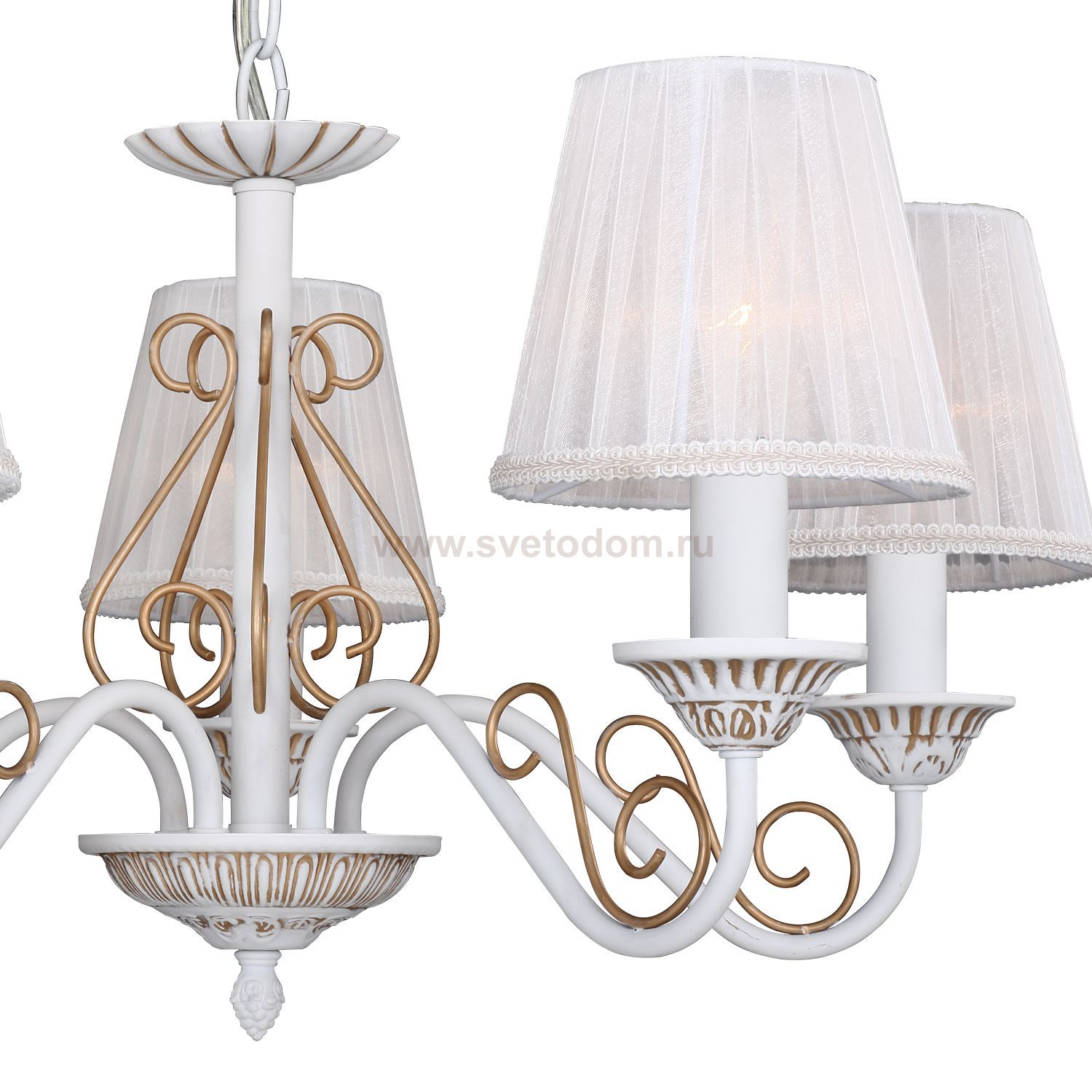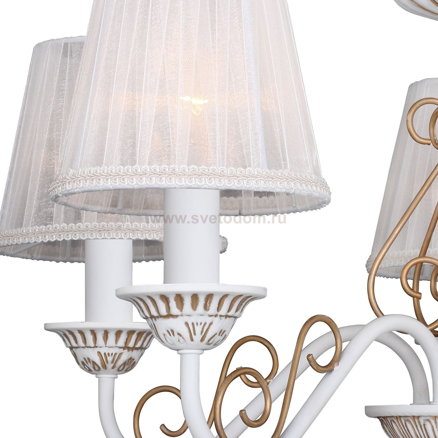 Изящные рожки дополнены витыми элементами. Светильники выполнены в белом цвете с золочением декоративных элементов в сочетании с абажурами из белой органзы. Можно использовать без абажуров. Материал плафона
