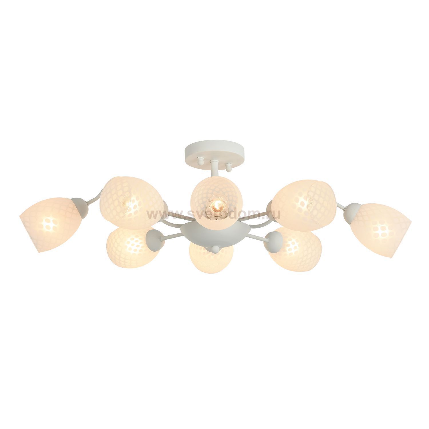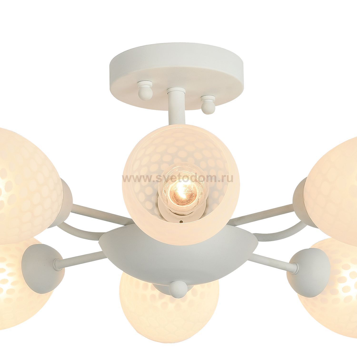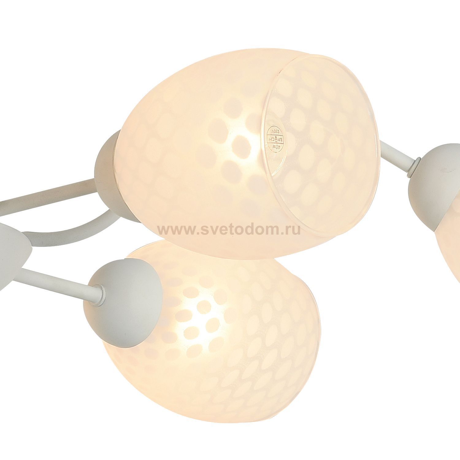 Cluster - серия потолочных люстр в современном стиле. Каркас окрашен в белый матовый цвет. Выдувные плафоны выполнены из полупрозрачного стекла с графическим узором. Компактная высота и удобная форма рожков позволяет использовать светильники в помещениях с невысокими потолками. Материал плафона