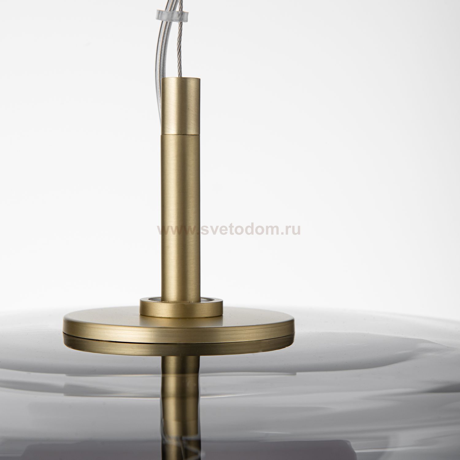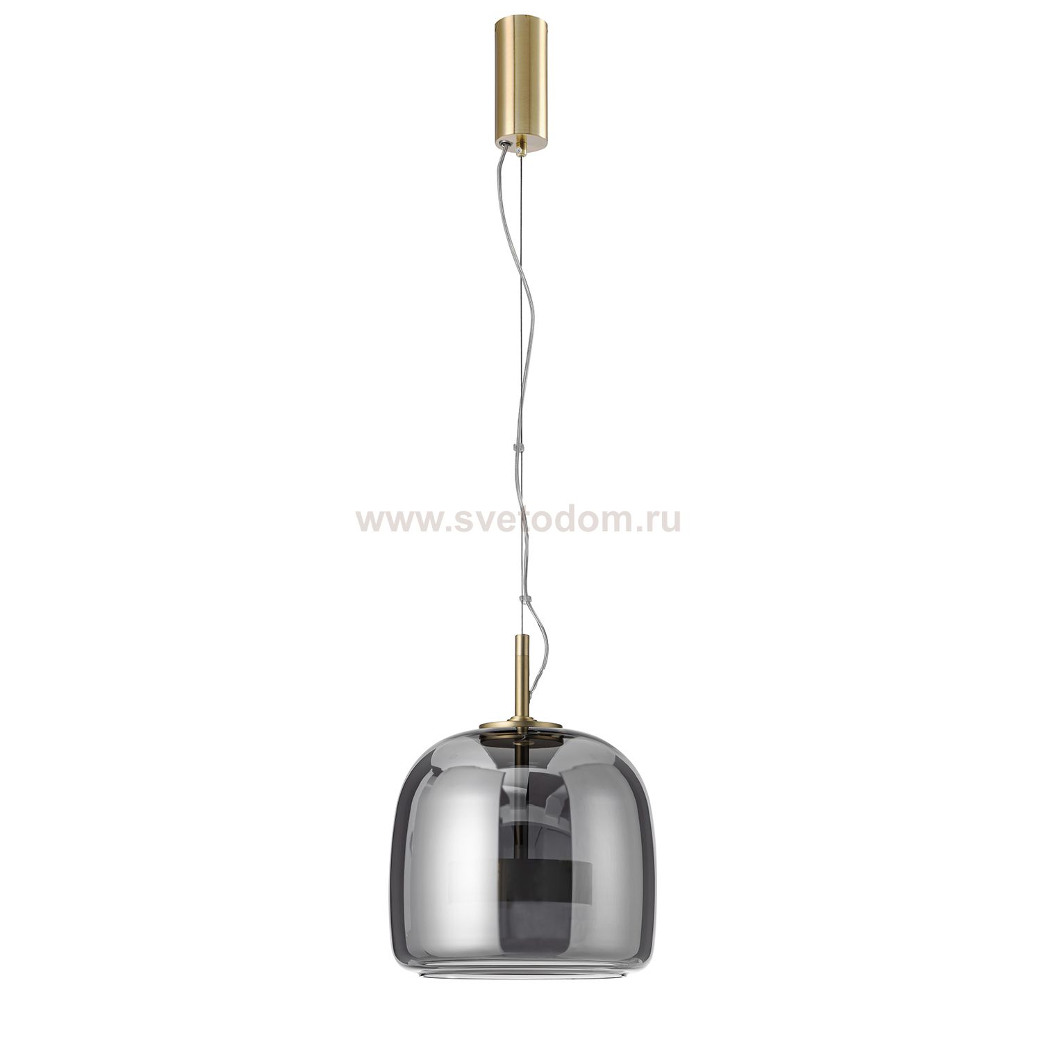 Подвес с золотым каркасом и двойным плафоном дымчато-серого цвета, внешний плафон выполнен из выдувного стекла, внутри металлический золотой цилиндр с Серия