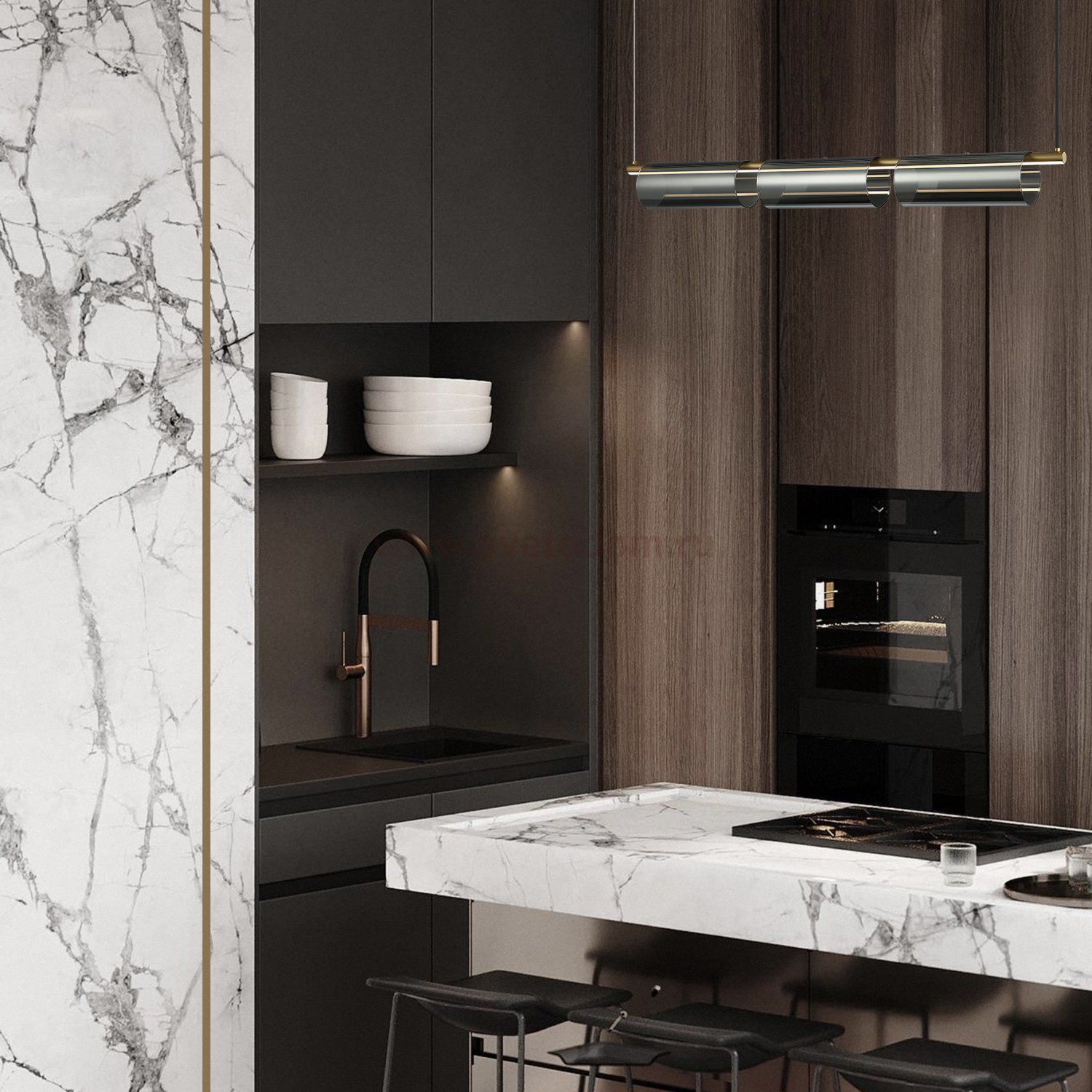 Арматура — металл, цвет — латунь. Плафоны из прозрачного стекла с дымчатым оттенком в форме овала, круга или конуса. Универсальный минималистичный дизайн позволяет составлять комбинации из нескольких подвесов. Регулируемая высота. Тренд «invisible light» - LED-источник света утоплен в основание плафона. Цветовая температура - 3000К.