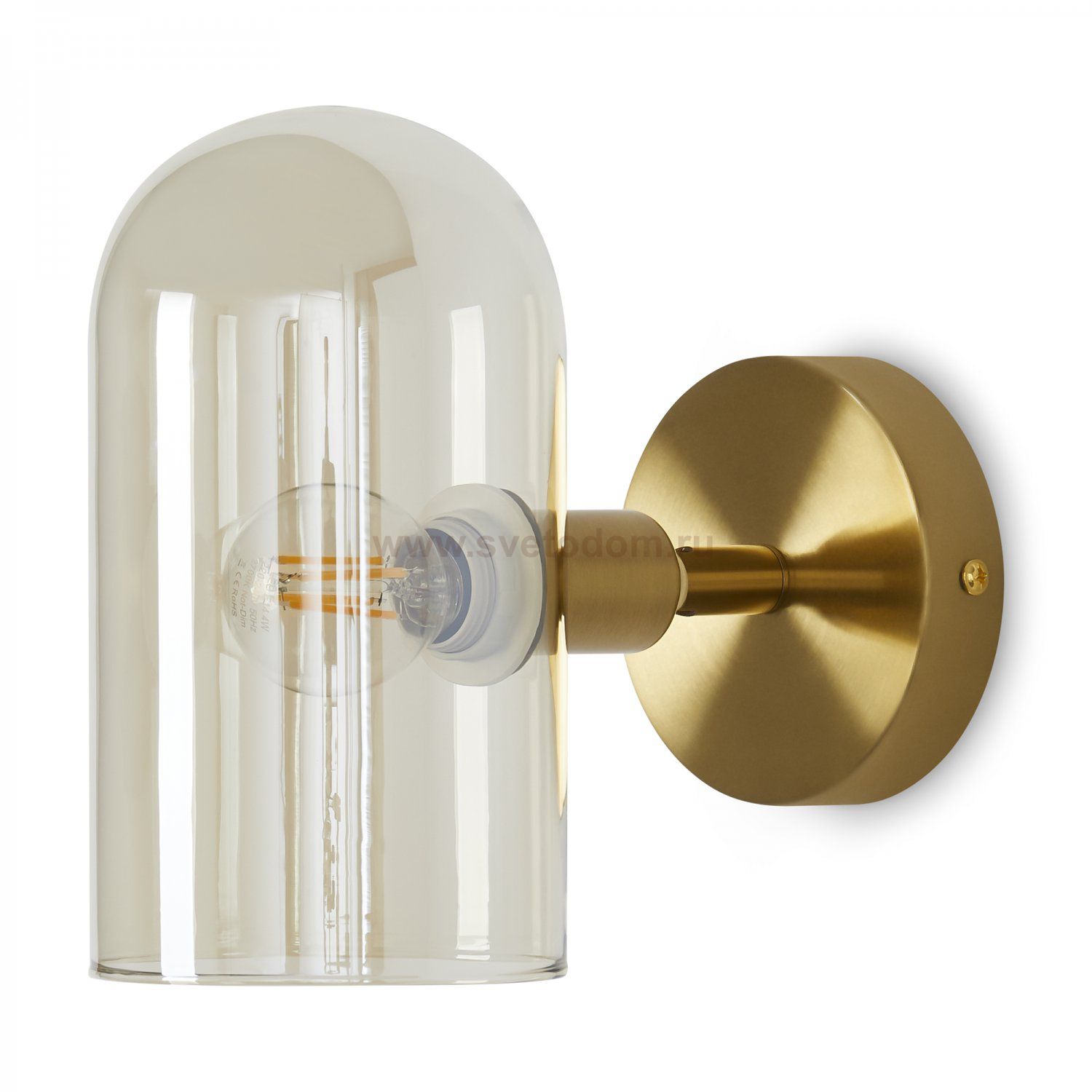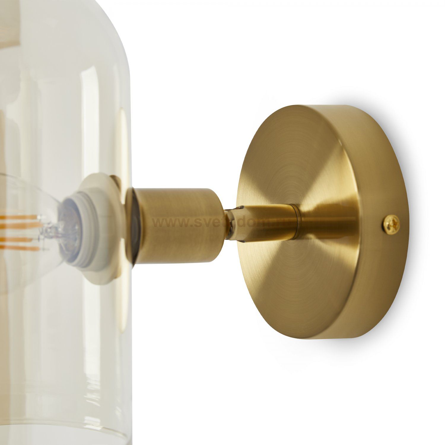 Арматура — металл. Цвет — латунь. Горизонтальные подвесы на твердой ножке. Плафоны из коньячного стекла в форме конуса. Направление плафона у настенного светильника можно регулировать за металлическое основание. Источник света лампа. Цоколь E14.