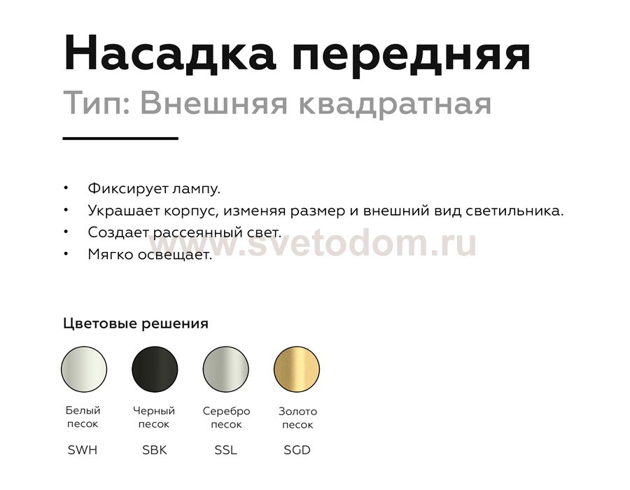 Коллекция DIY Spot предназначена для создания индивидуального светильника, под каждый стиль и интерьер. В многочисленных моделях этой коллекции вы сможете подобрать насадку, любого цвета, материала и текстуры к любому корпусу Коллекции DIY Spot. Насадки могут быть двух типов: передняя, которая уникально украсит ваш корпус и задняя, благодаря которой, возможен любой тип крепления: накладной, подвесной или трековый. Насадки, размером 70*70мм, подойдут к корпусам с размером отверстия 70*70мм.