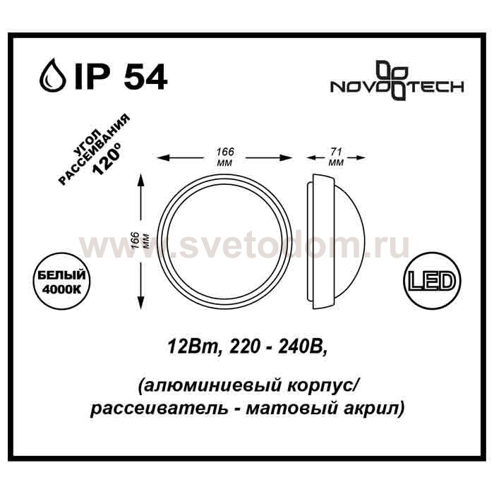 Уличный светодиодный светильник настенно-потолочного монтажа модели Novotech 357184 из серии OPAL отличается следующим качеством: Влагозащищённый светильник. Корпус светильника состоит из алюминия. Это металл, основными достоинствами которого являются — устойчивость к практически всем видам негативного воздействия окружающей среды, коррозии, небольшой вес, по сравнению с другими видами металла и экологическая безопасность материала. Рассеиватель произведён из матового акрила. Свойствами которого являются: высокая светопропускаемость — 92 %, которая не изменяется с течением времени, сохраняя свой оригинальный цвет, сопротивляемость удару в 5 раз больше, чем у стекла, устойчивость к воздействию влаги, бактерий и микроорганизмов, морозостойкость и экологичность. Экономичность (КПД порядка 90%), отсутствие токсичных элементов (не наносят вред здоровью, не требуют специальной утилизации), отсутствие ультрафиолетового излучения, пожаробезопасность (не нагреваются), морозостойкость, ударопрочность и устойчивость к вибрациям. Диапазон рабочих температур от -20 до +50 градусов Цельсия.