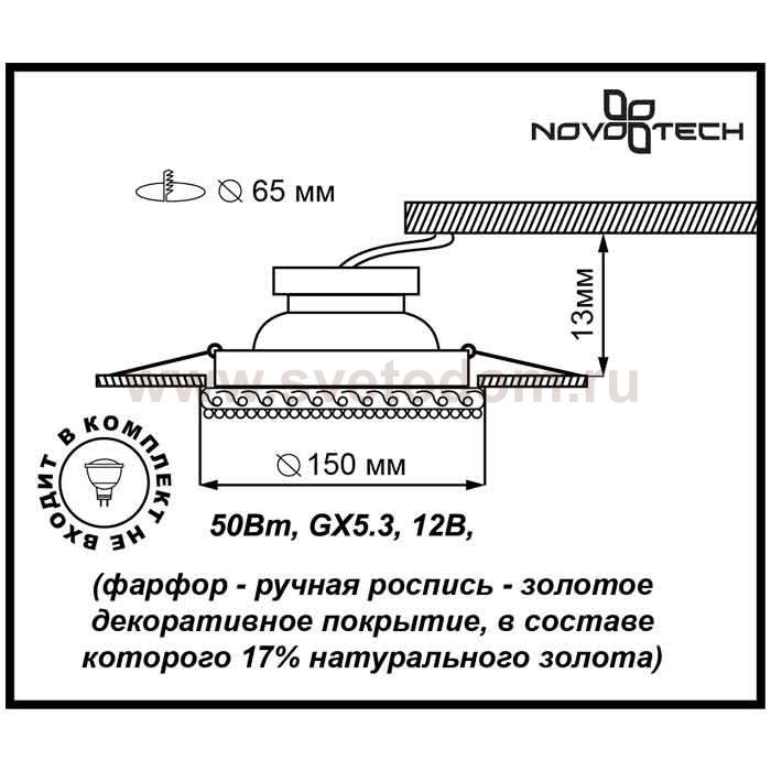 фарфор, ручная роспись, золотое декоративное покрытие, в составе которого 17% натурального золота Материал плафона