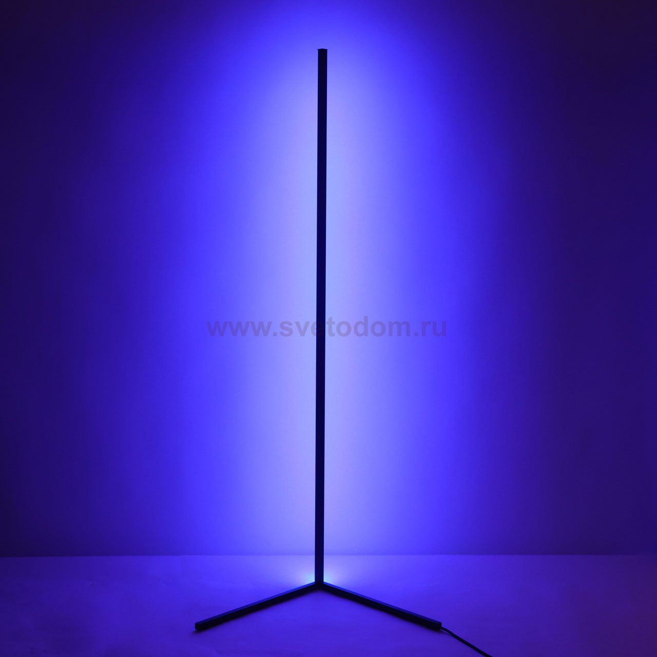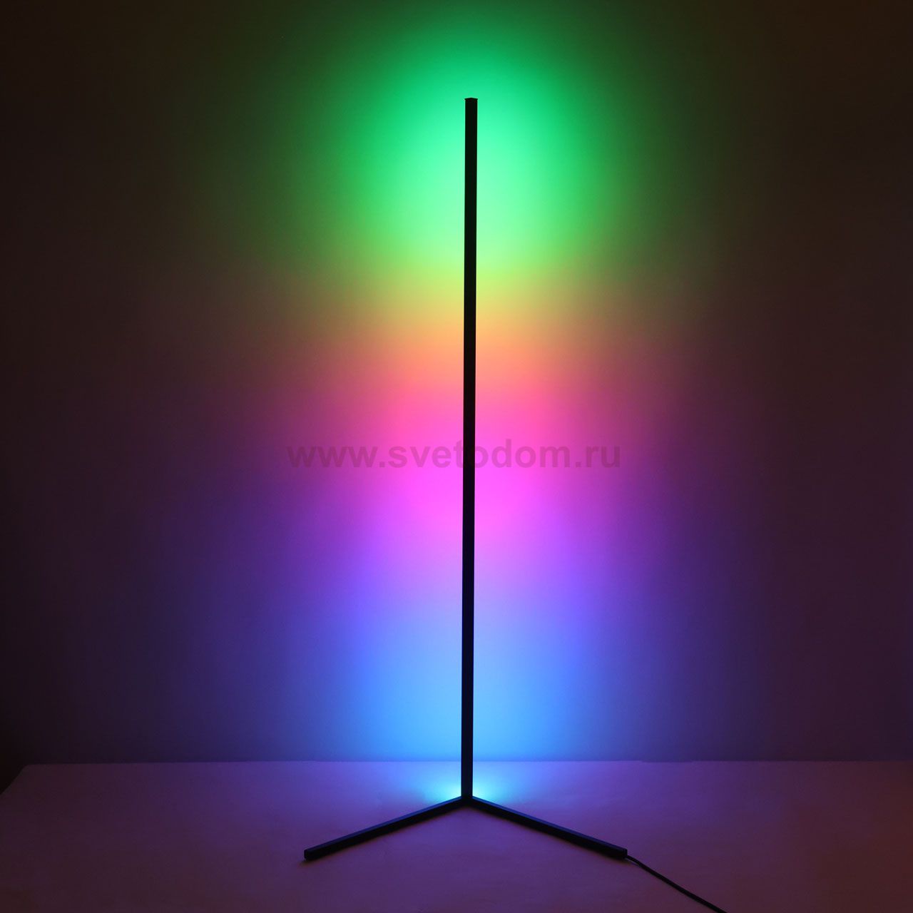 Металлическое основание торшера окрашено в черный цвет. Корпус плафона выполнен из сплава алюминия и окрашен в цвет основания. Светодиодный источник света RGB закрыт белым матовым акрилом. В комплект входит пульт. Комментарий