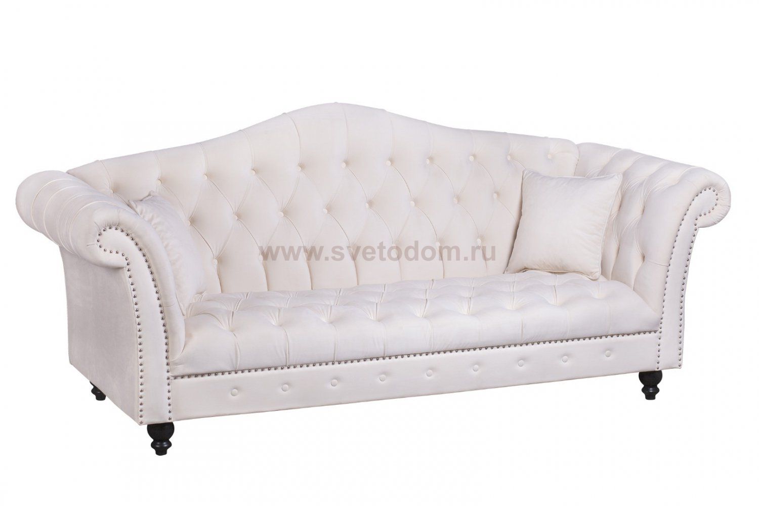 Большой трехместный велюровый бежевый диван Calee beige украшен каретной стяжкой и объемной, выгнутой кверху спинкой. Этот диван станет главным украшением Вашей гостиной, а его изысканные формы не оставят равнодушными никого!