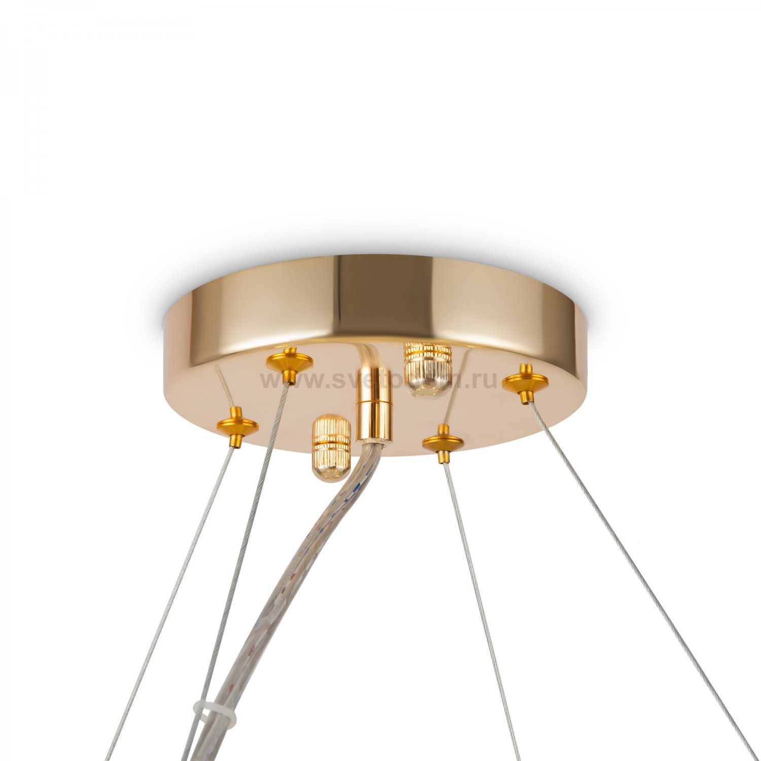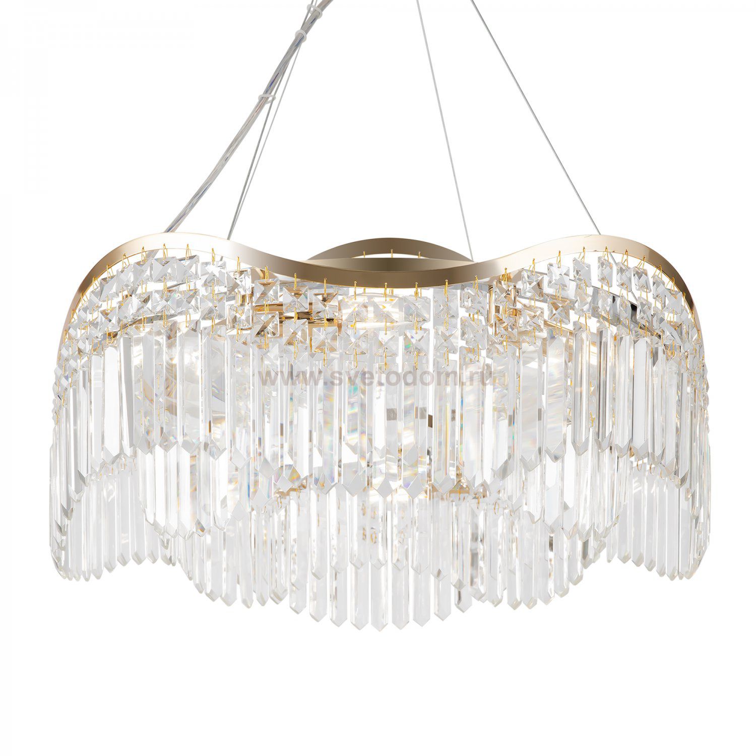 Металлическая арматура в золотом цвете. Декоративные подвески различной формы и огранки. Оригинальные волнообразные очертания светильника. Трендовый эффект парения. Ассортимент для общей и зональной подсветки.