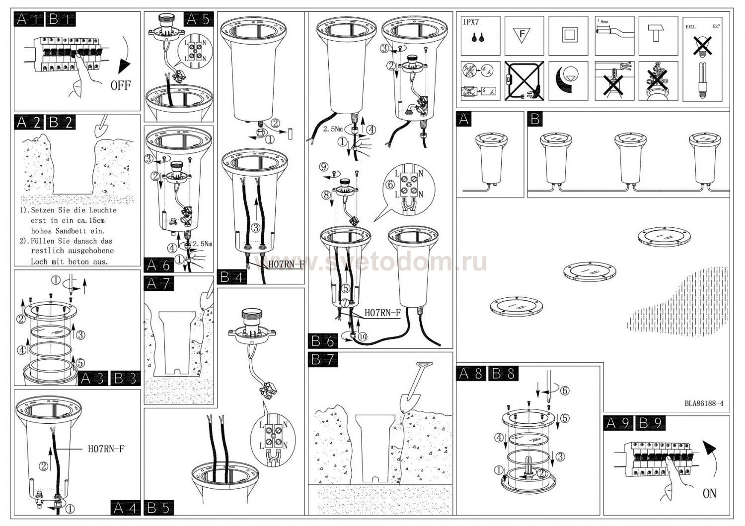Врезные энергосберегающие парковые светильники EGLO RIGA 3 (IP67), галогенные парковые светильники EGLO RIGA 1 (IP44) и экономичные врезные светодиодные парковые светильники PARK 1 (IP67) — светильники для наружного освещения. Светильник EGLO PARK 1 (IP67) арт. 88069 — новинка 2008. Степень защиты IP67 — полная защита от пыли (пыленепроницаемый, dust-light), защита от проникновения воды при погружении (waterproof) степень защиты IP44 — защита от твердых тел > 1 мм, защита от капель и брызг. Рассеиватели тротуарных светильников 1, 2, 6, 7 — из пластика арматура всех светильников — из нержавеющей стали, подземная часть светильников 1, 2 — пластиковая. Светильники 3, 4, 5 снабжены штырем для облегченной установки в землю. Светильники 1, 2 рассчитаны на энергосберегающую компактную люминесцентную лампу PL 15W E27, светильники 3, 4, 5 - на рефлекторную галогенную лампу GU10 220V 50W. Светильники 6, 7 имеют светодиодный модуль 12 LED 12V 1,2W предлагаются комплекты из 3-х светильников: в комплект входят светильники, лампы и трансформатор соответствующей мощности. Цвет RIGA 3 (IP67): 1 — черный (black), 2 — нержавеющая сталь (niro) цвет RIGA 1 (IP44): 3 — белый (white), 4 — антрацит (anthracite), 5 — нержавеющая сталь (stainless steel) цвет PARK 1 (IP67): 6, 7 — никель матовый (nickel frosted).