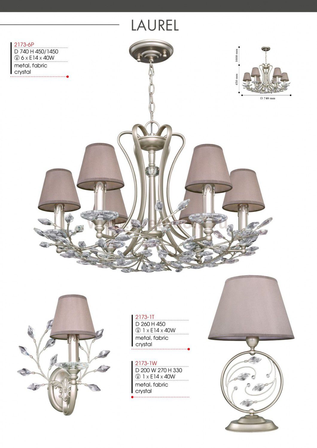 арматура светло-золотого цвета, абажуры из шелковой ткани тепло-серого цвета, хрусталь высшего качества Материал плафона