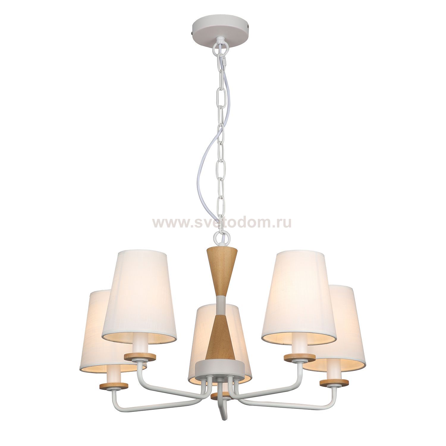 каркас белого цвета, декоративный элемент из светлого дерева, плафоны из белой ткани Цвет декора